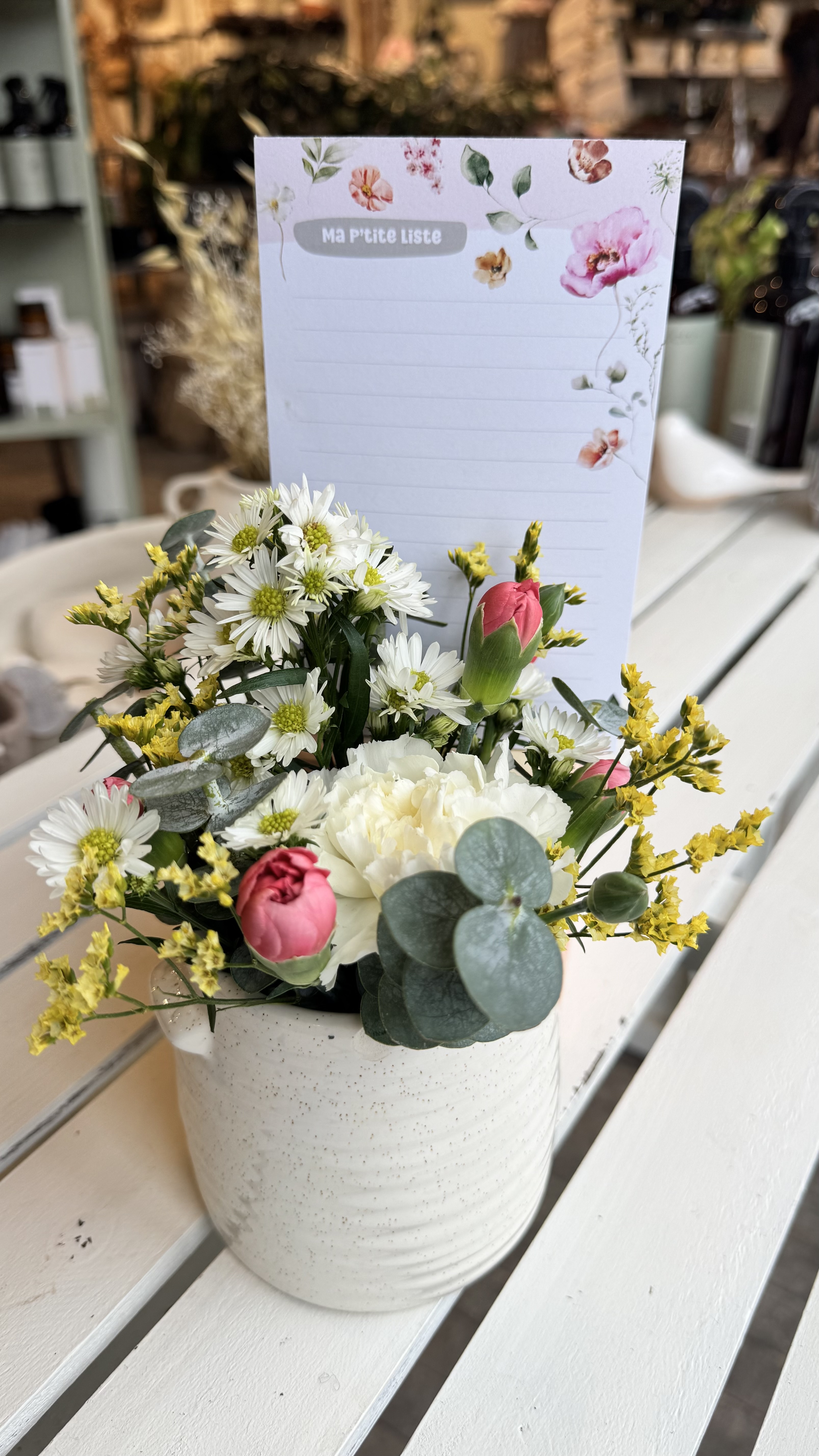 Bouquet floral dans un cache pot accompagné d'un magnifique bloc note d'une compagnie québécoise