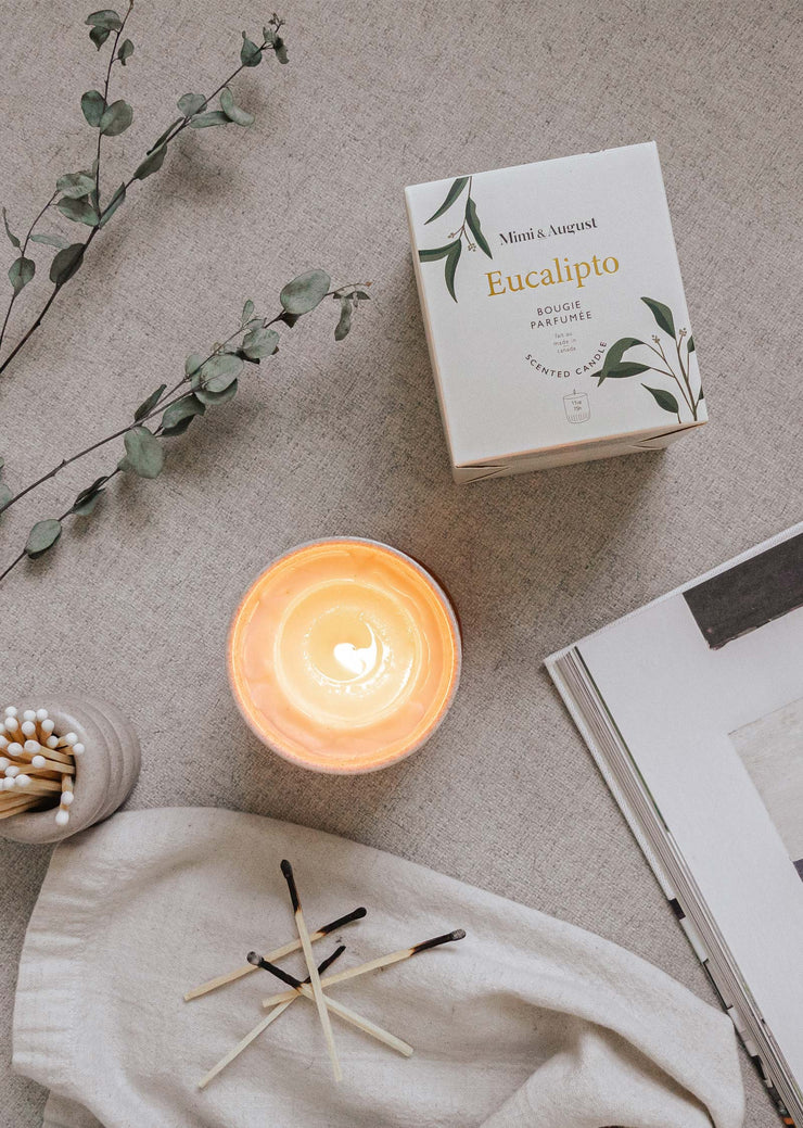 À base de cire de soya, fragrance Eucalyptus.