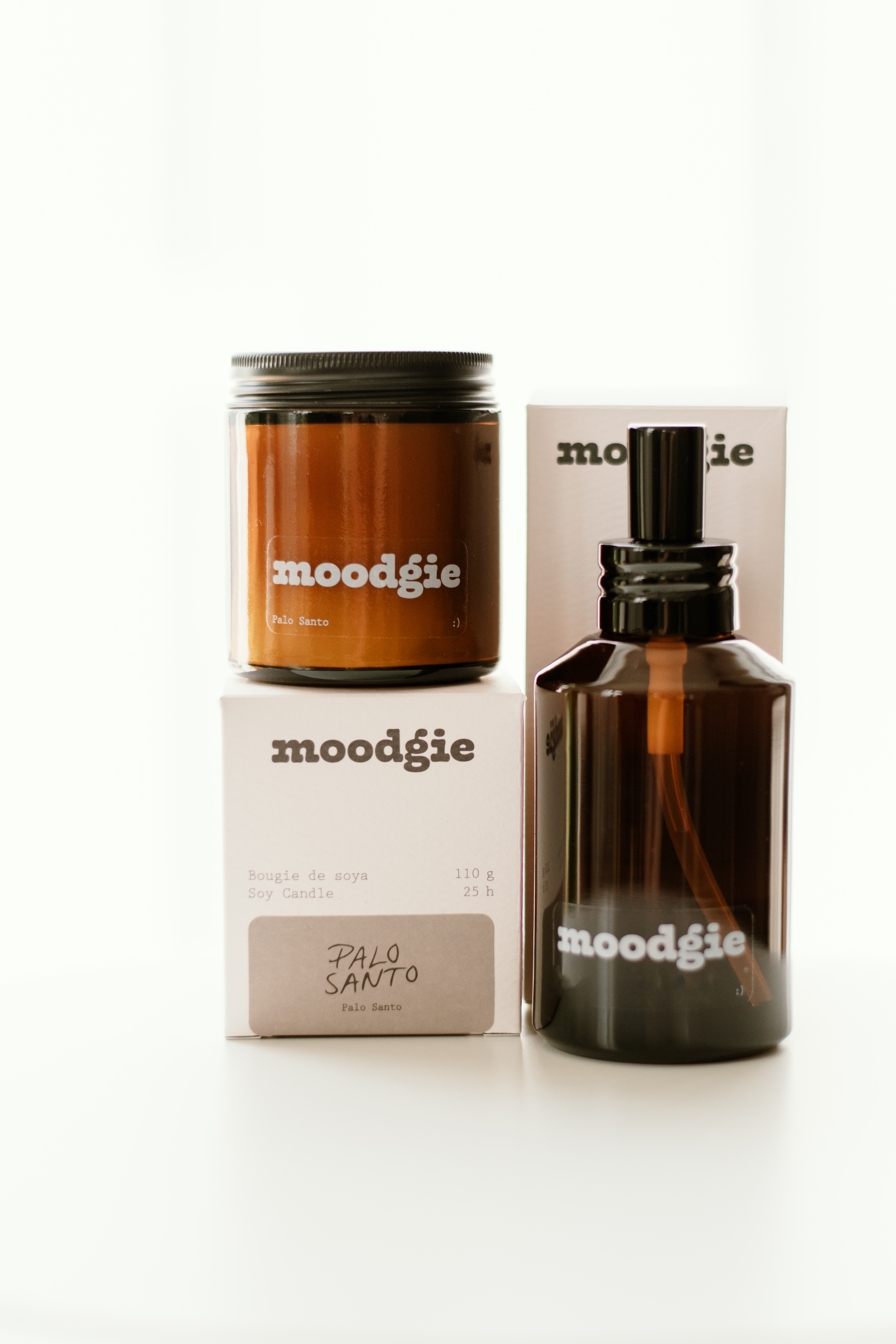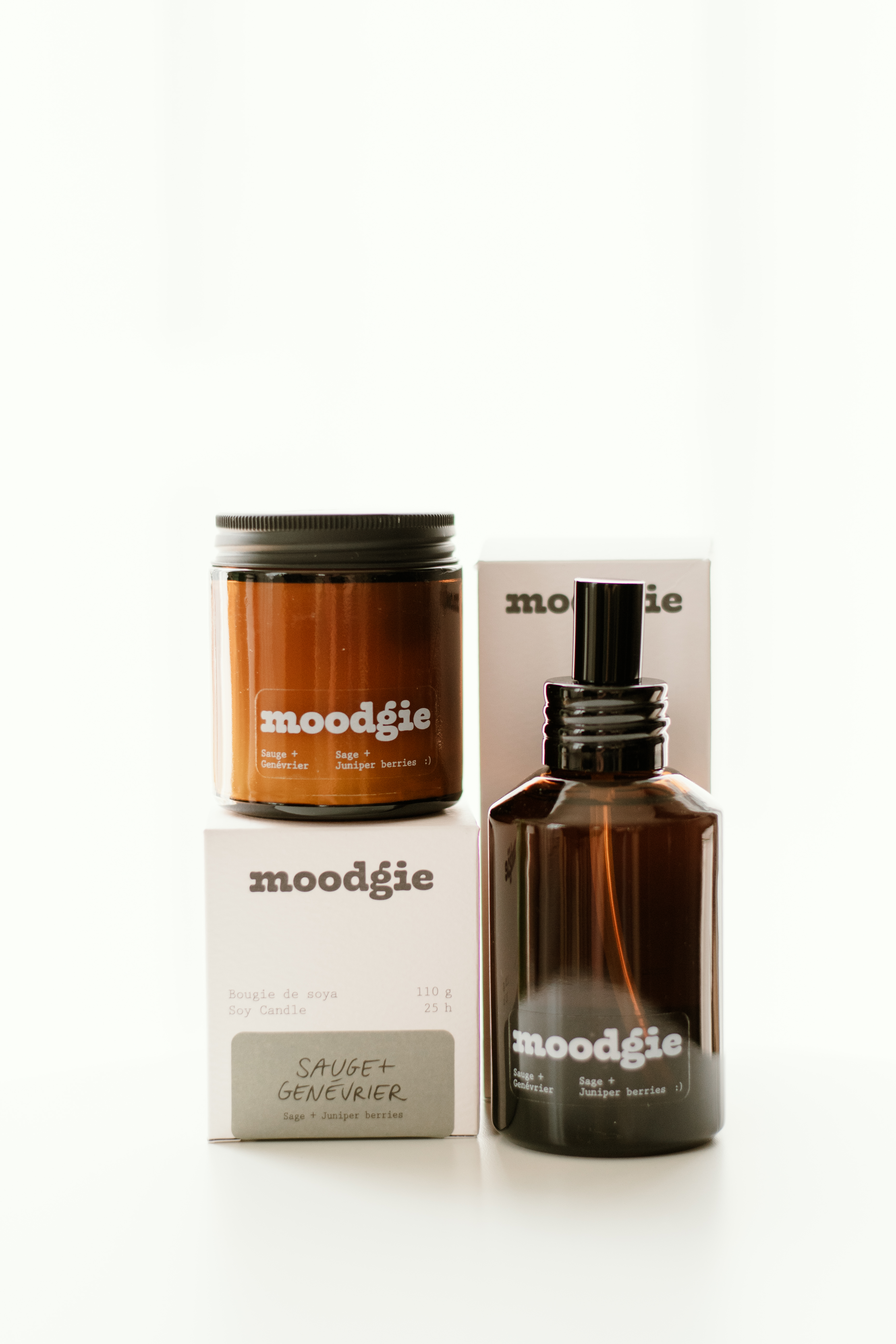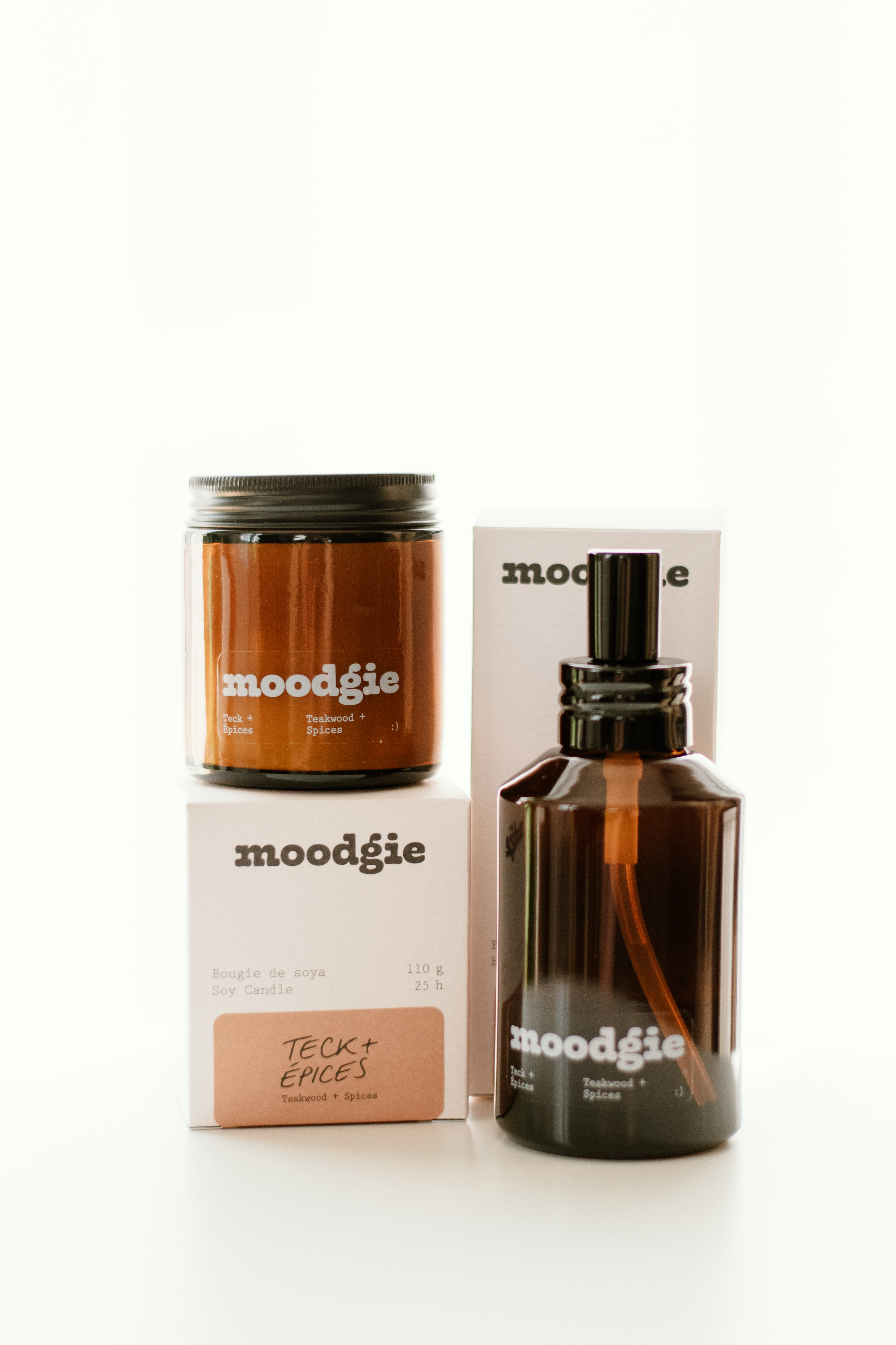 Bougie de soya 110 g et parfum d'intérieur 120 ml de la compagnie moodgie, fait à Montréal