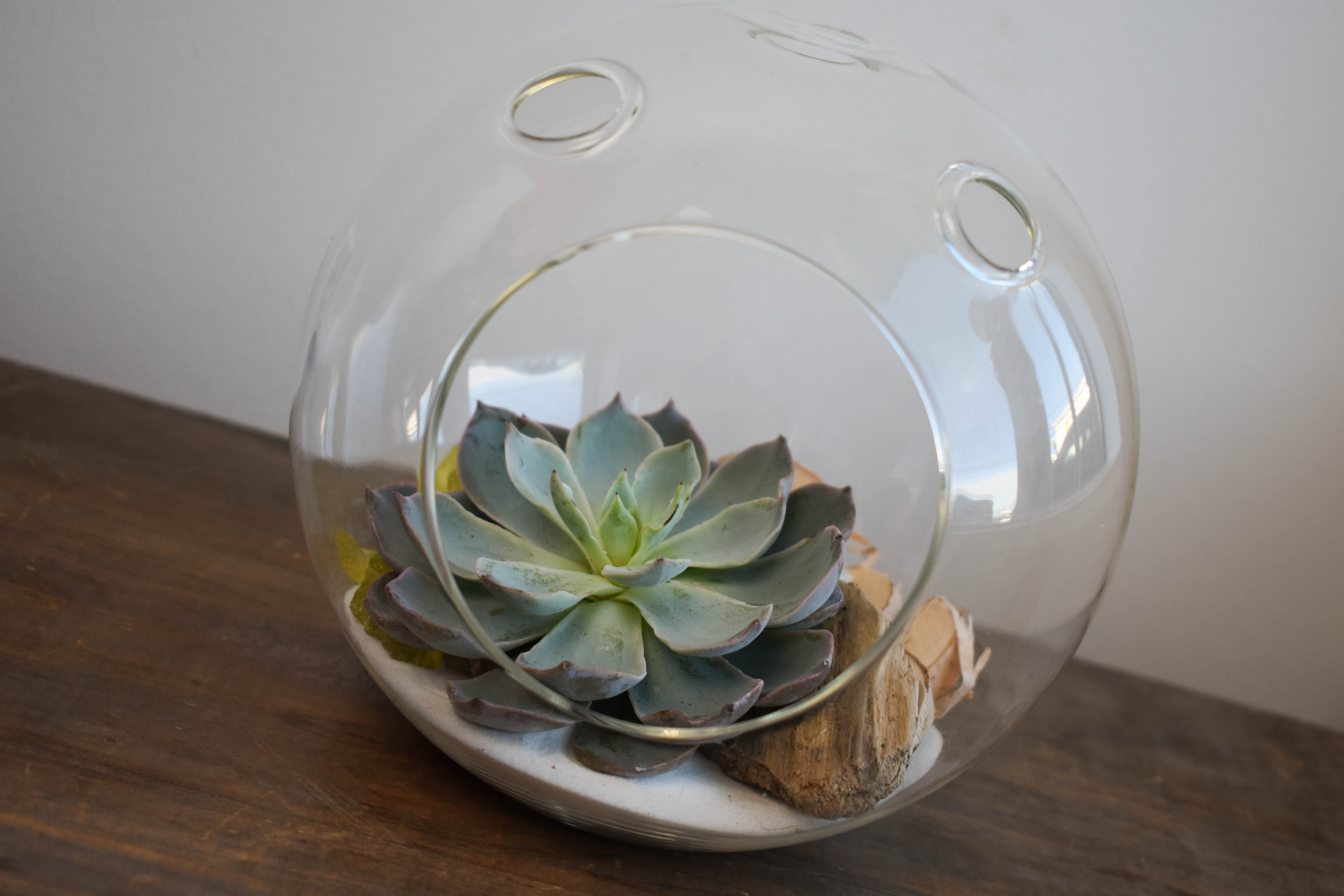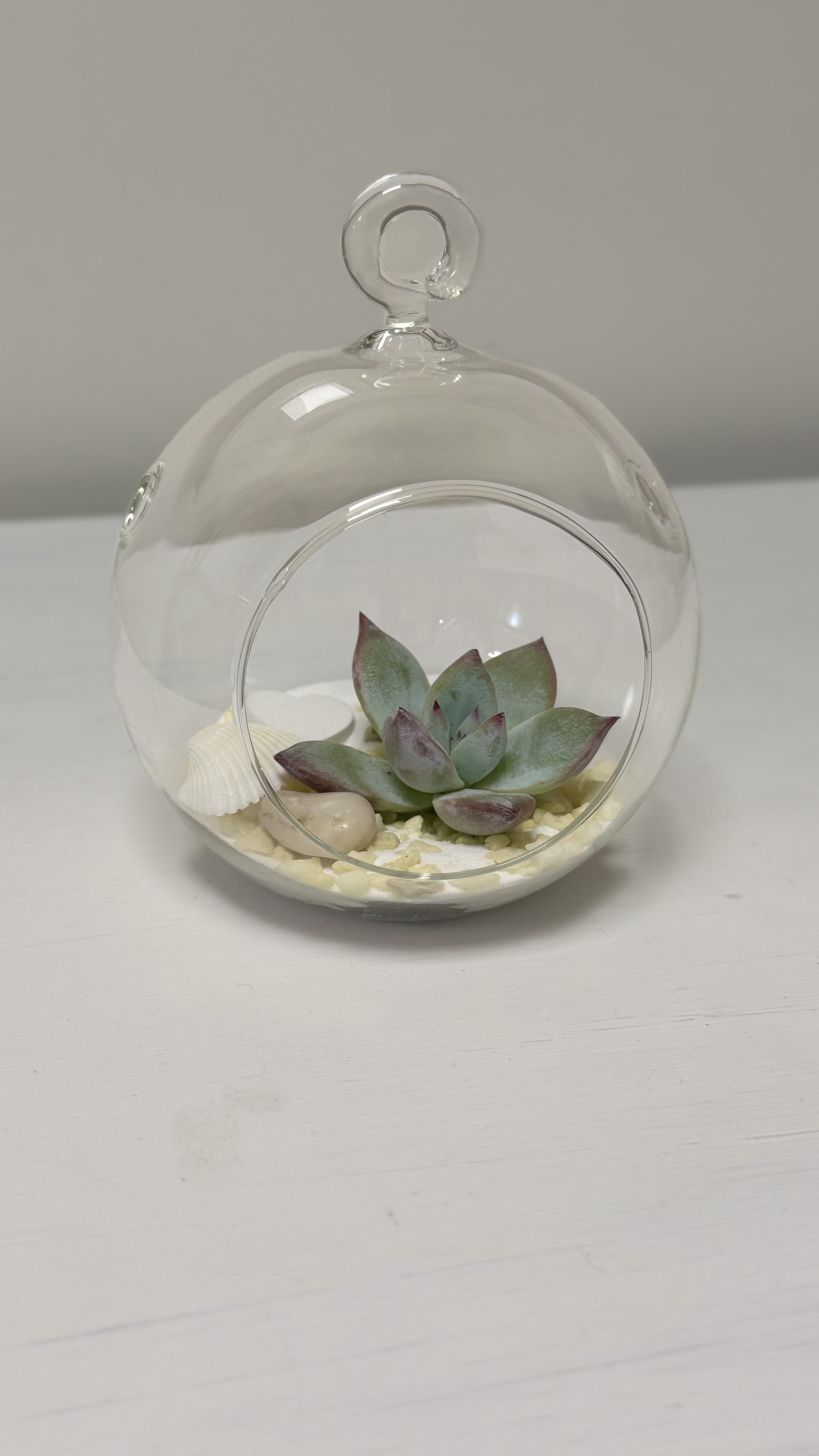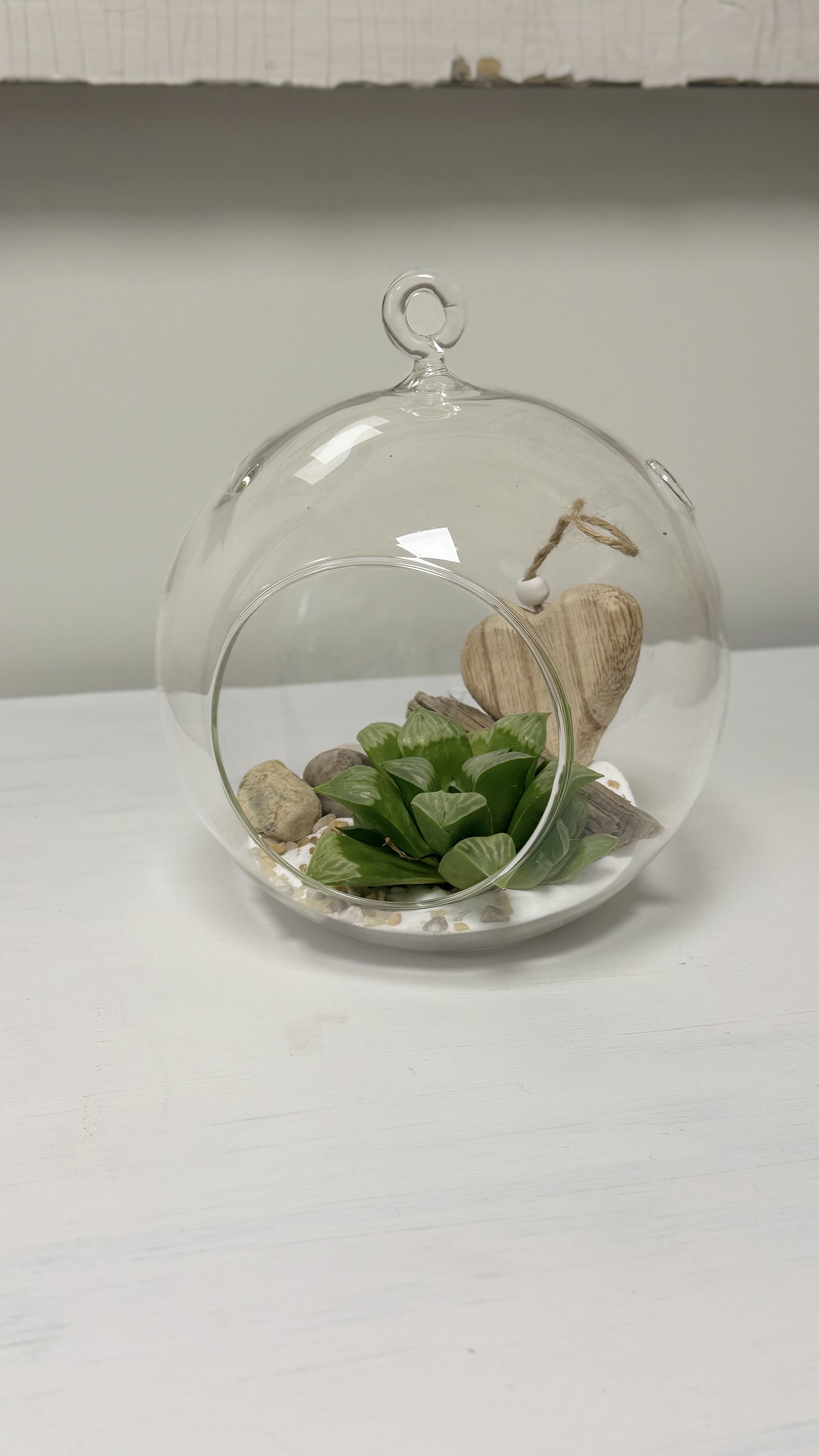 Terrarium en bulle de verre pouvant être déposé ou suspendu avec plante succulente à l'intérieur