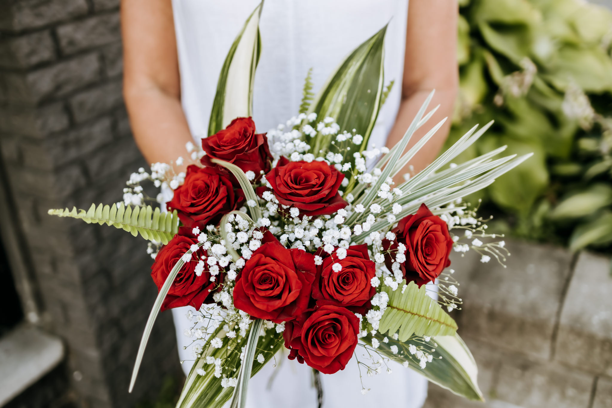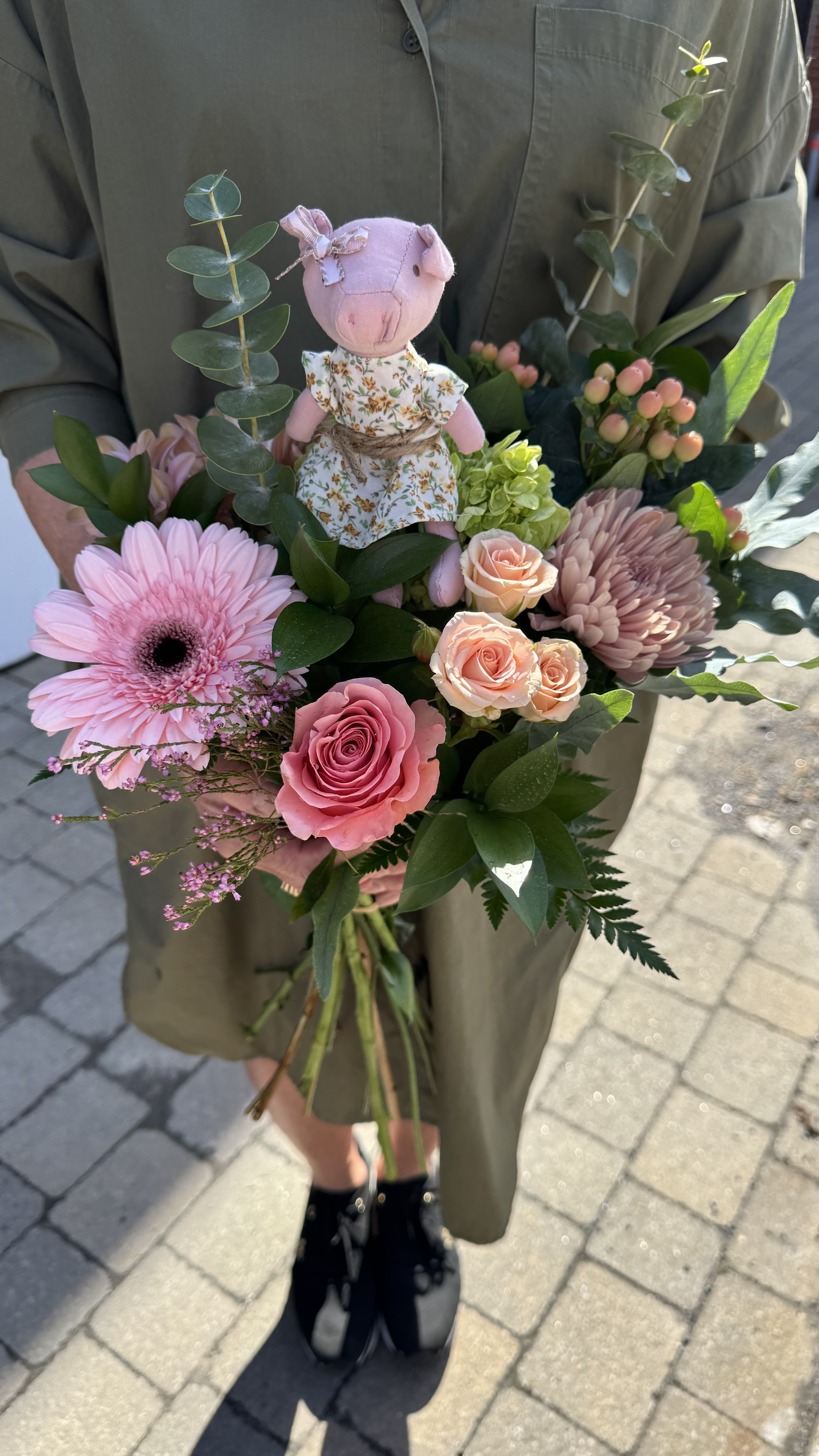 Bouquet de fleurs fraîches dans les tons de rose et blanc avec petit toutou. Photo en inspiration, fleurs au choix de la fleuriste