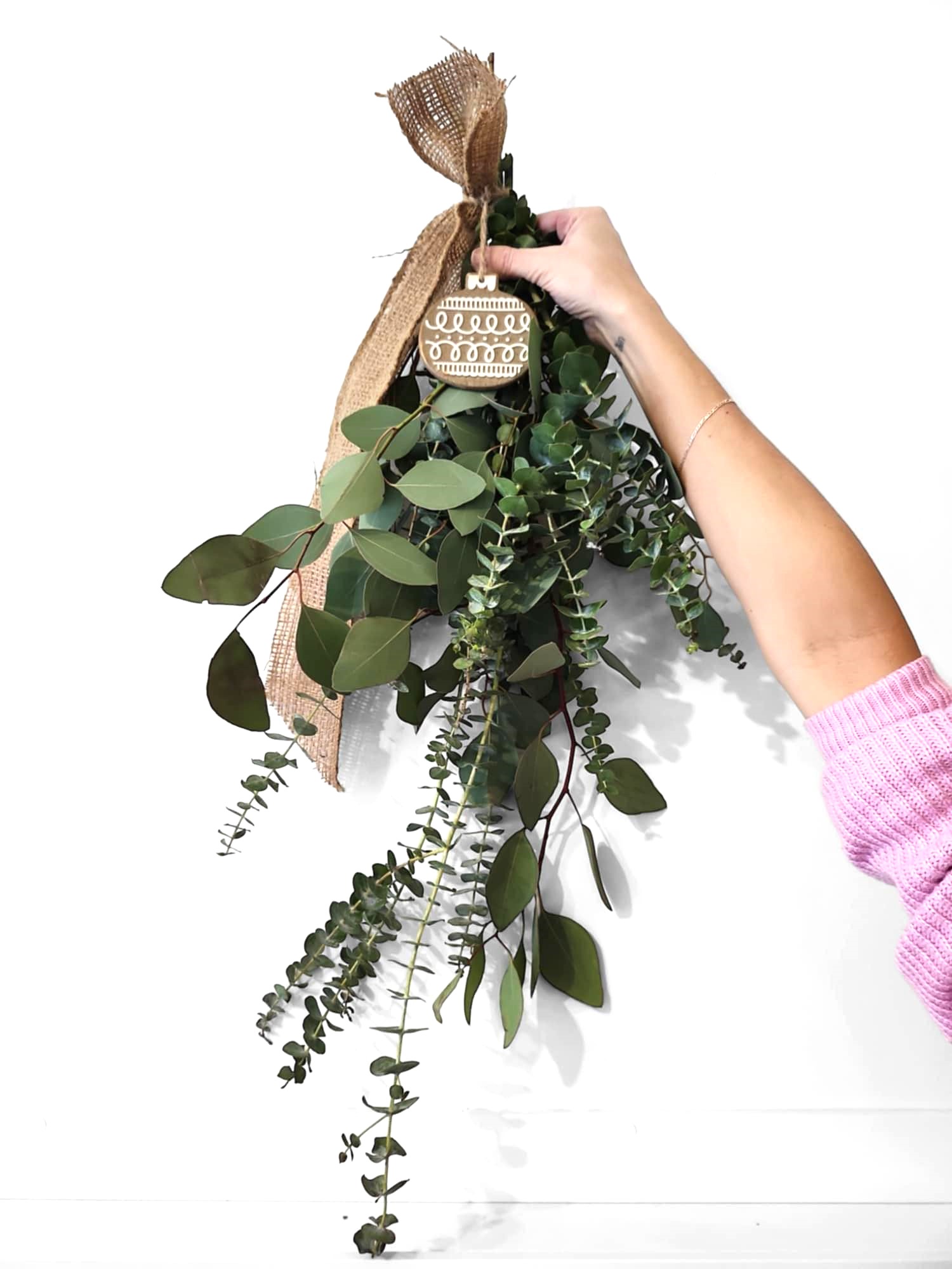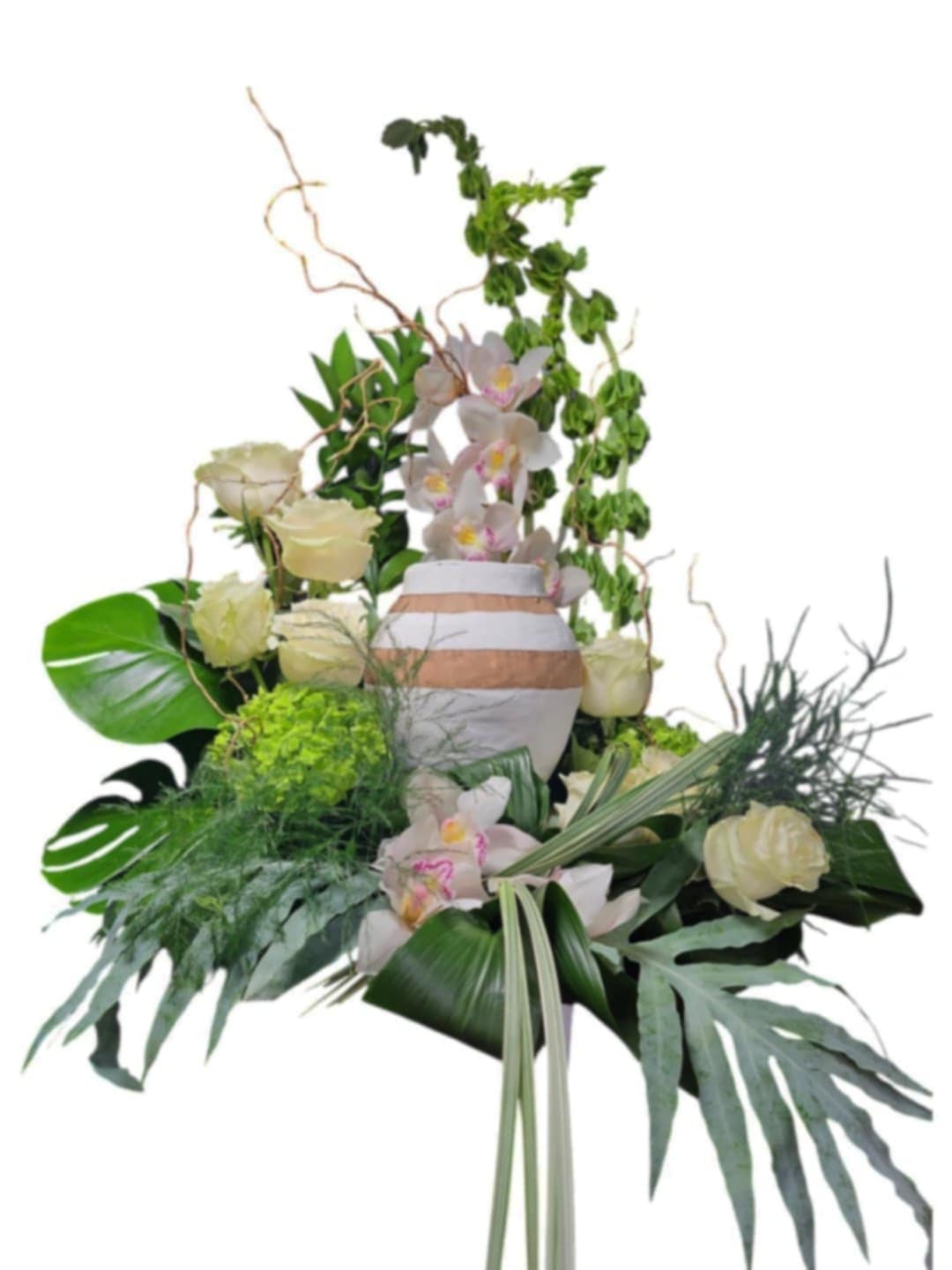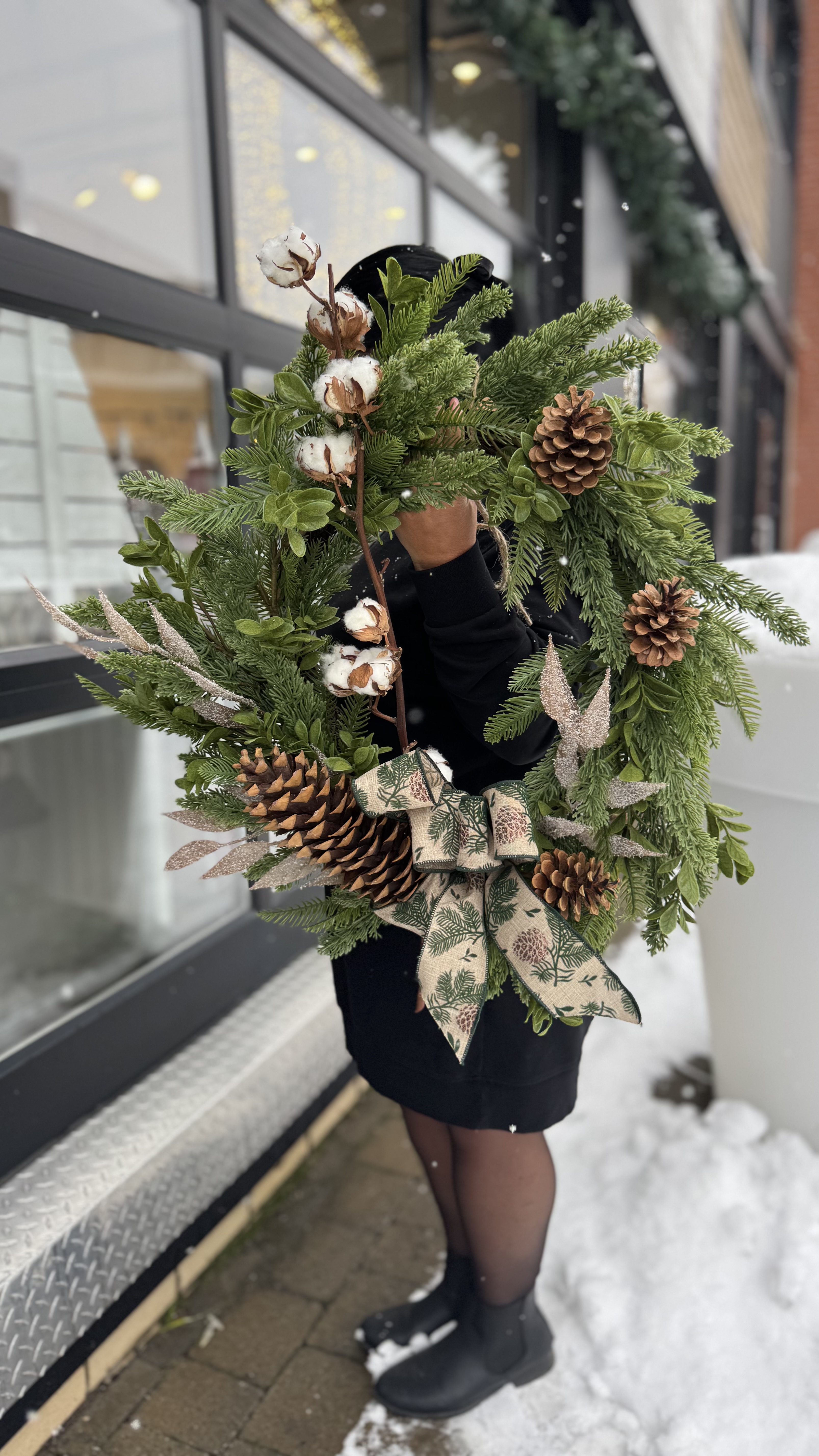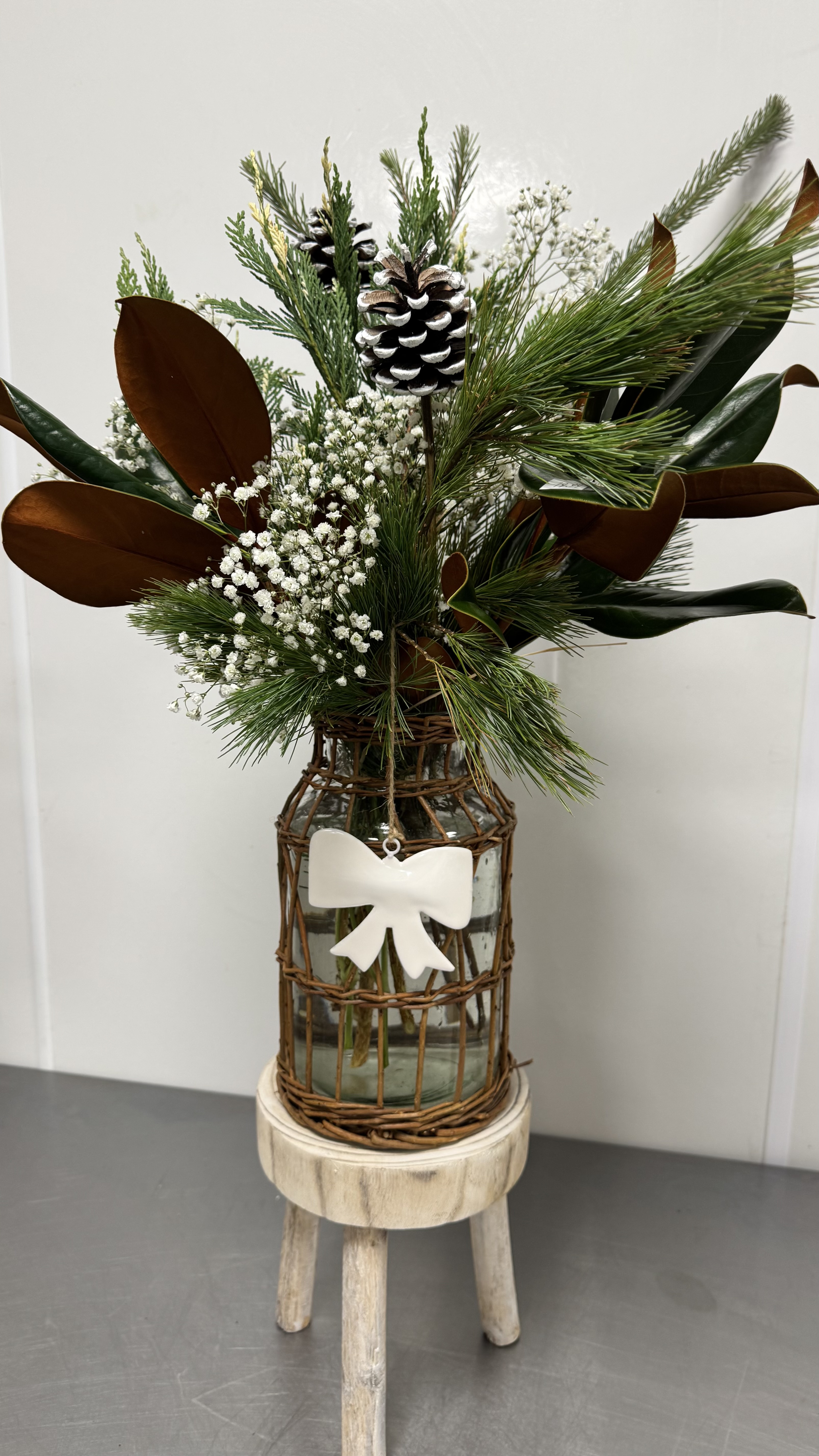 Grand arrangement dans un vase avec boucle devant. Hauteur entre 16 et 20 pouces. Contient un mélange de feuillage hivernal avec cocotte de pin