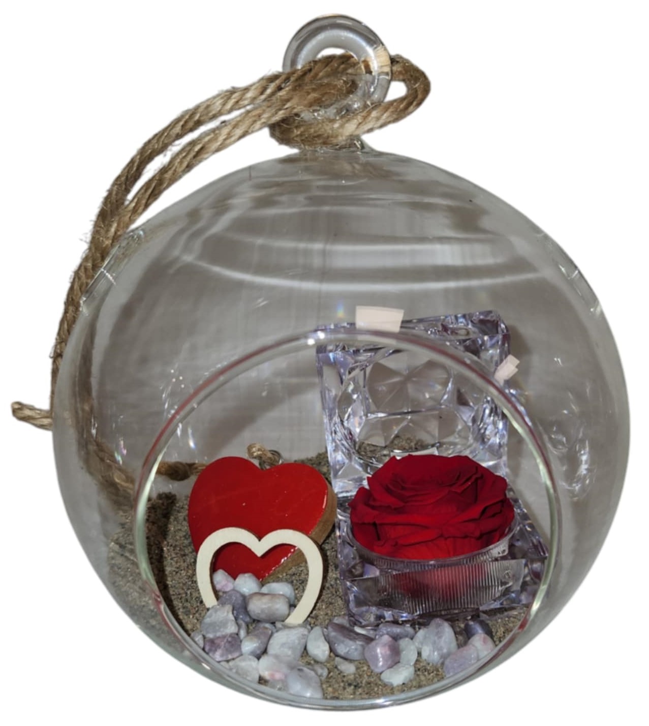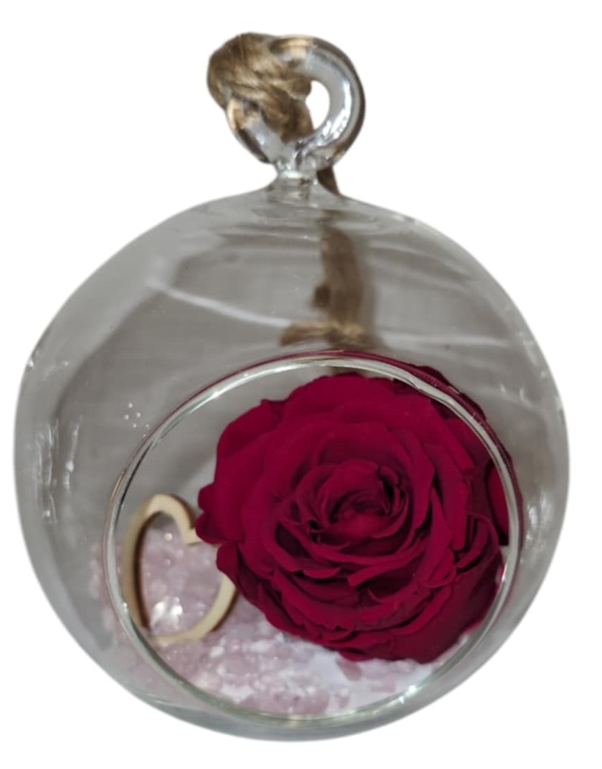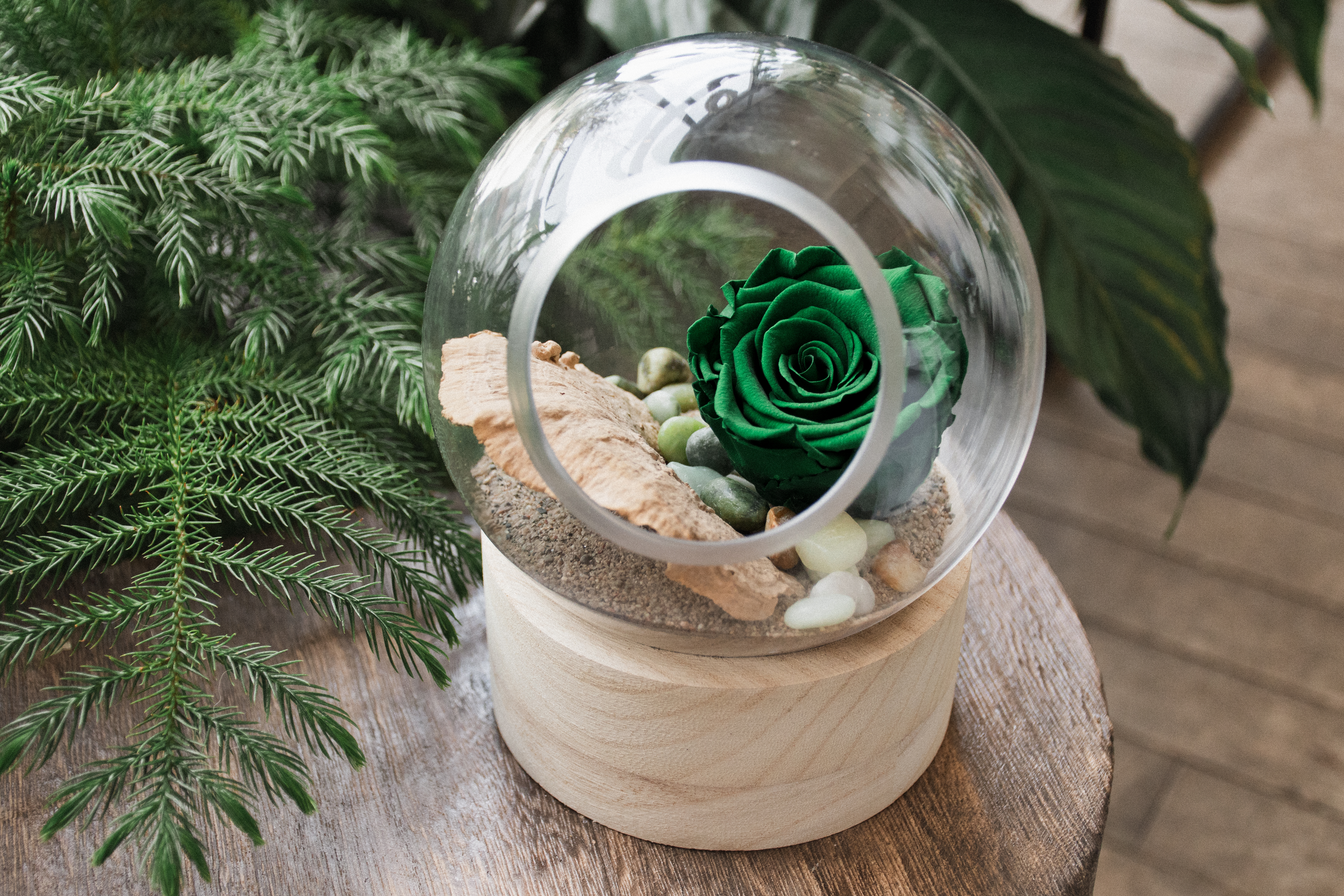 Terrarium en bulle de verre avec base en bois naturelle. Contient une rose éternel verte qui ne nécessite aucun entretien