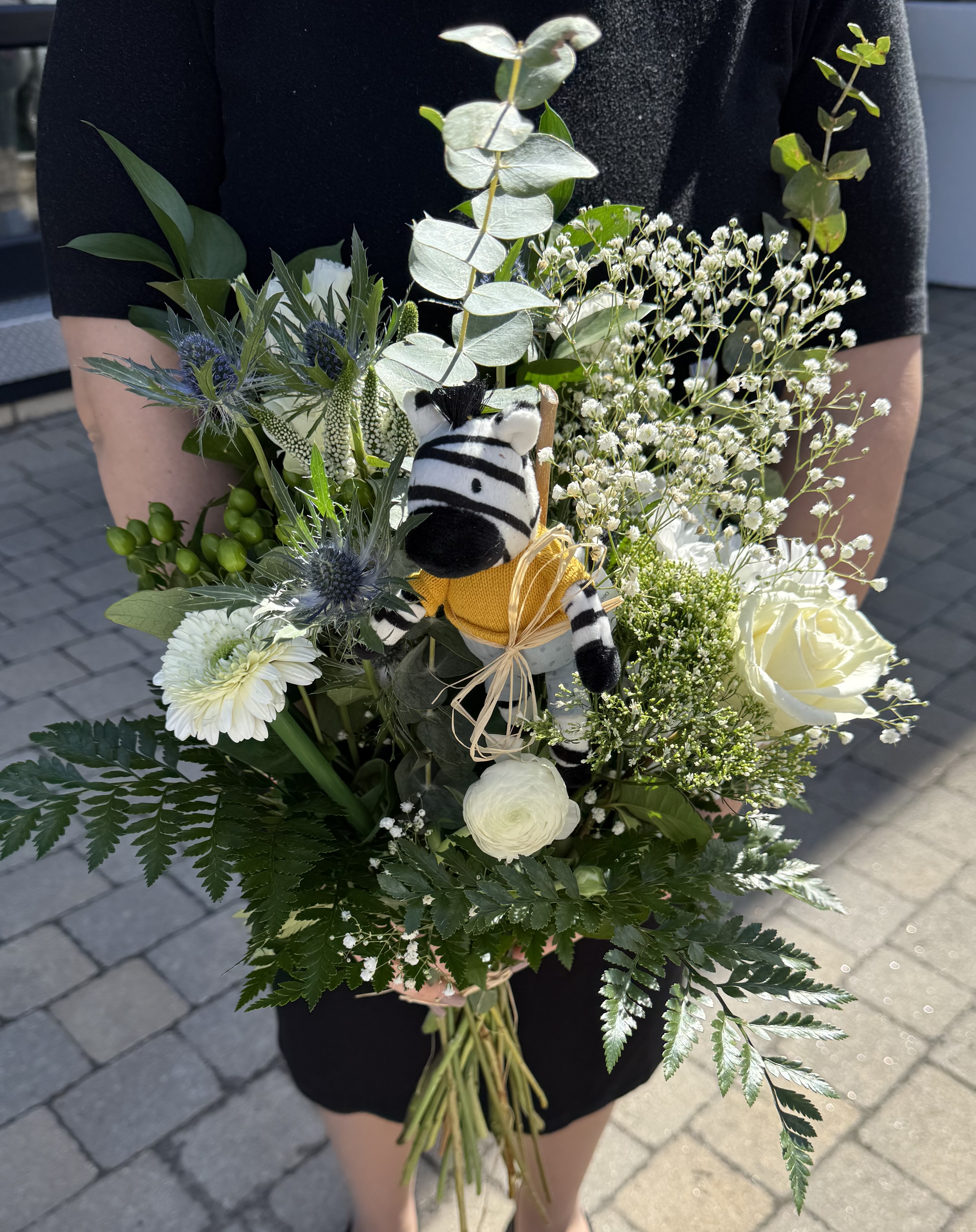 Bouquet de fleurs fraîches dans les tons de bleu et blanc avec petit toutou. Photo en inspiration, fleurs au choix de la fleuriste