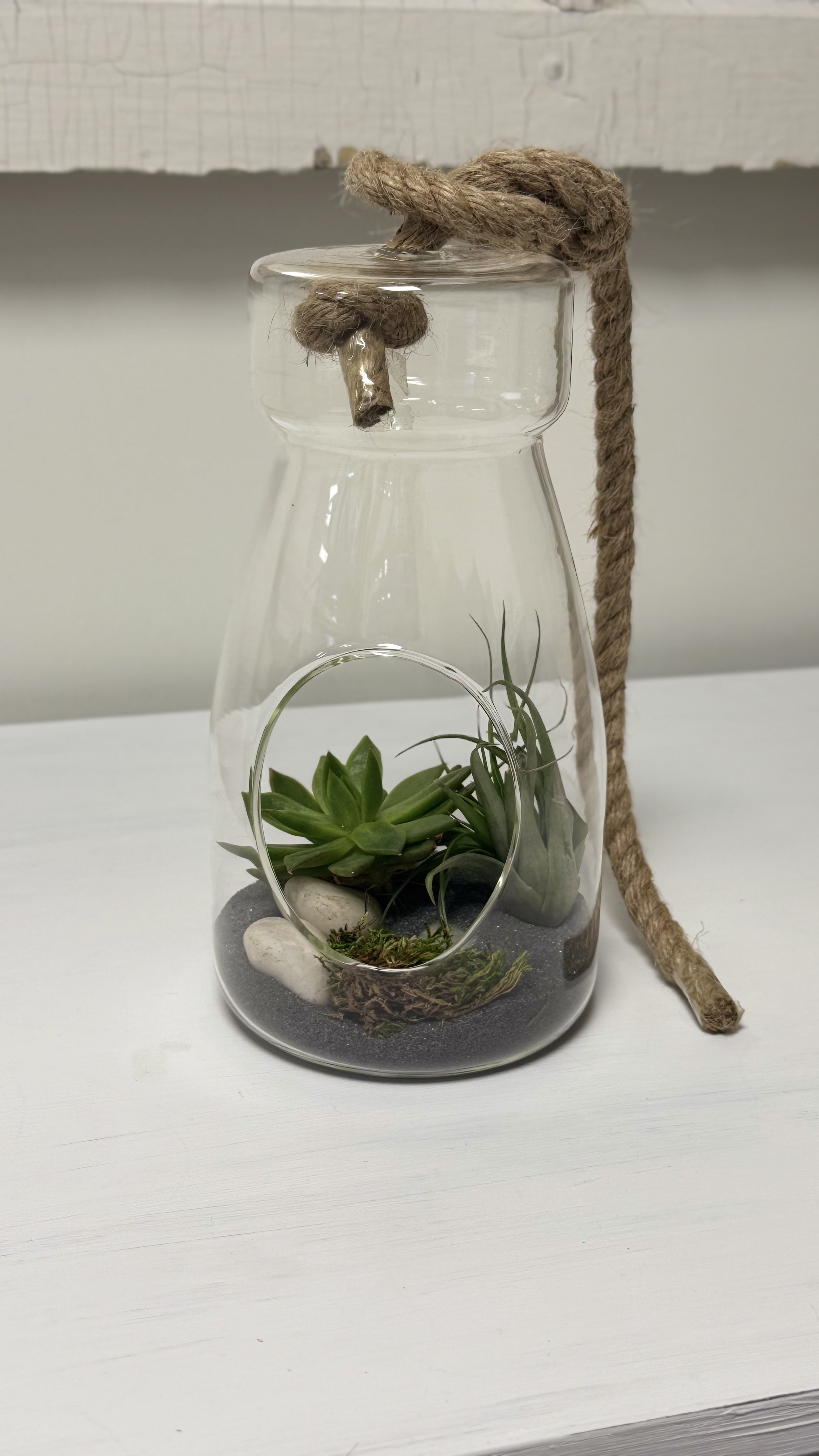 Terrarium pouvant être déposé ou suspendu, avec plante succulente à l'intérieur