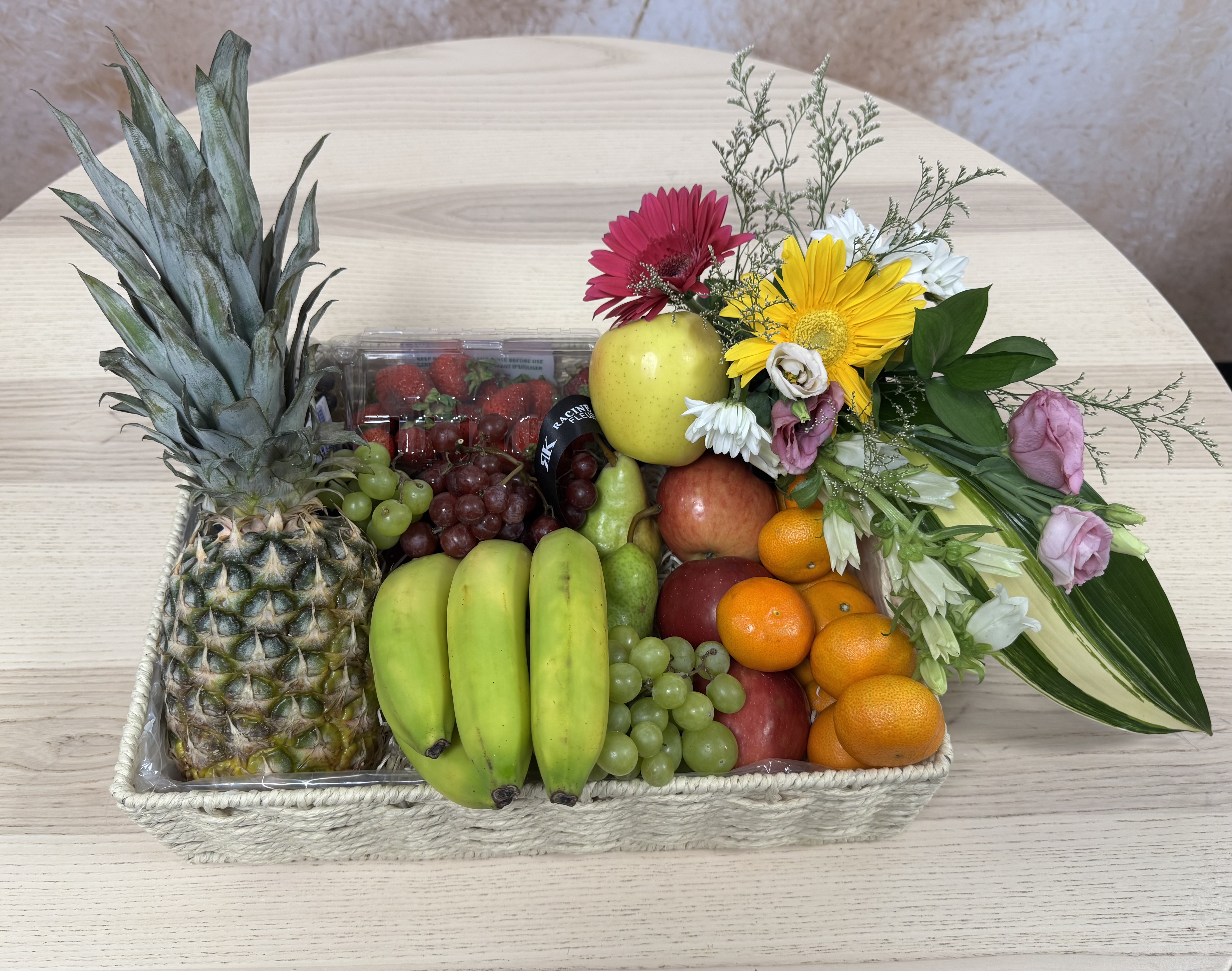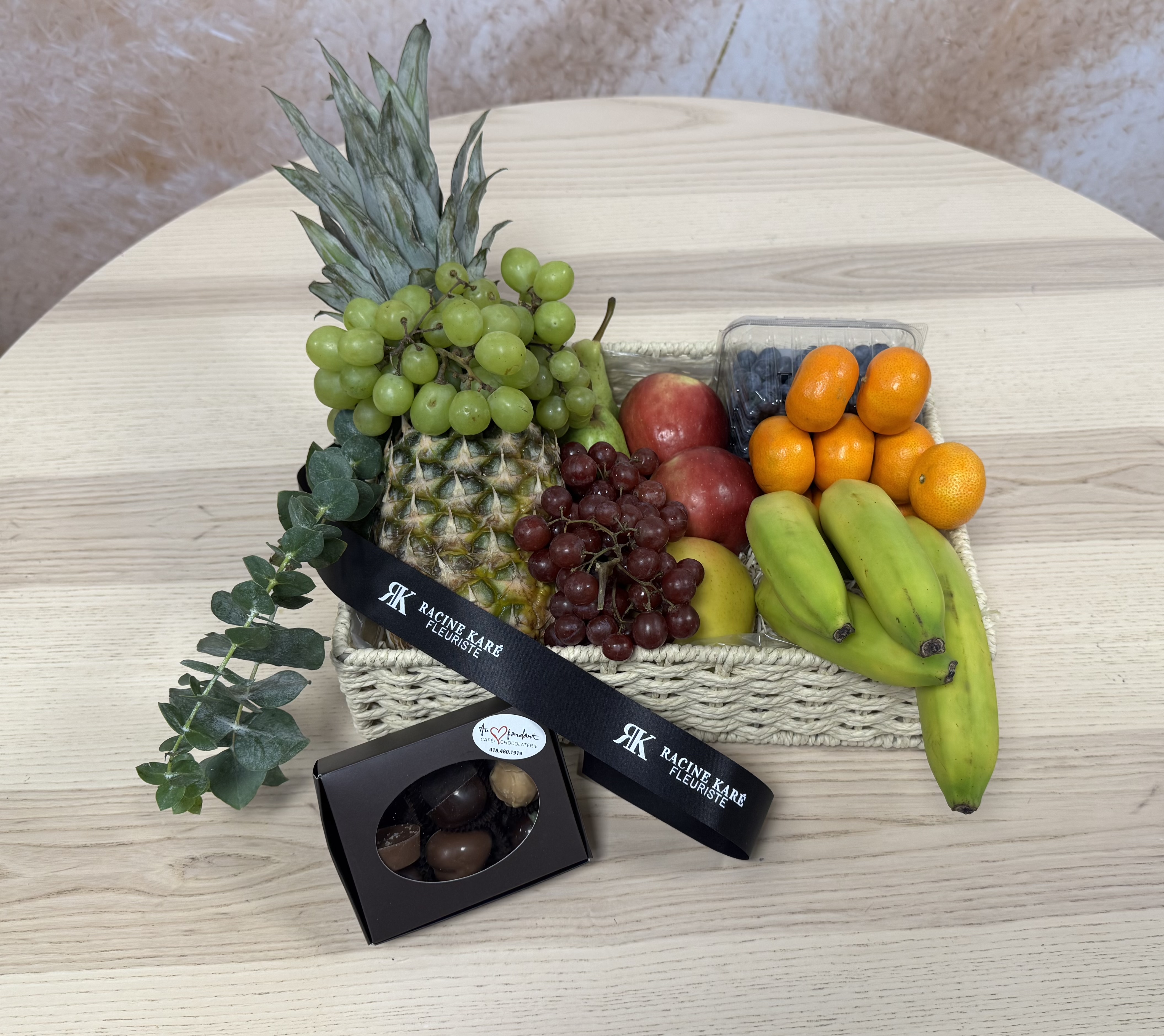 Panier de fruit frais, accompagné de 6 chocolats fins de la chocolaterie au cœur fondant et de branches d'eucalyptus