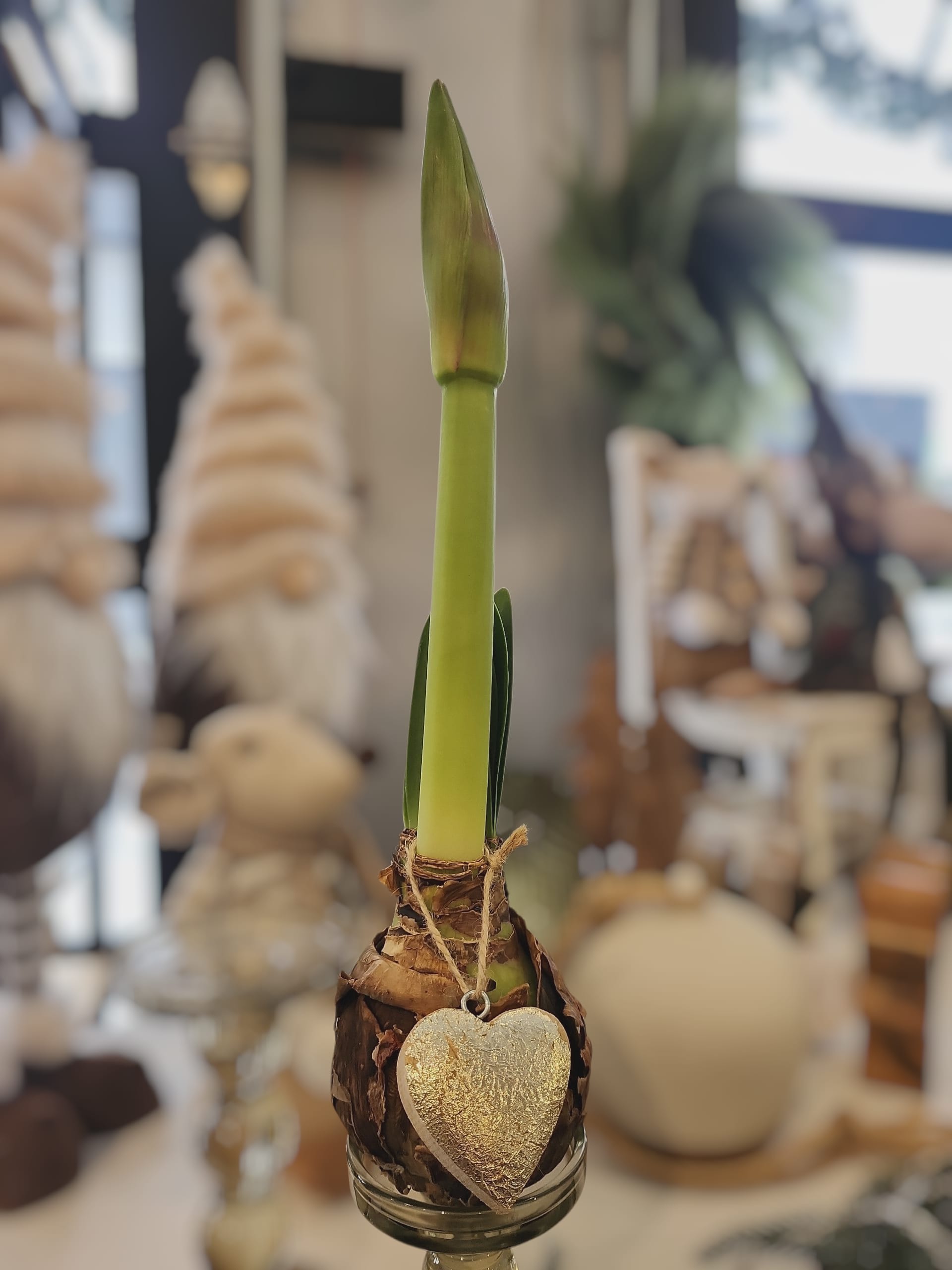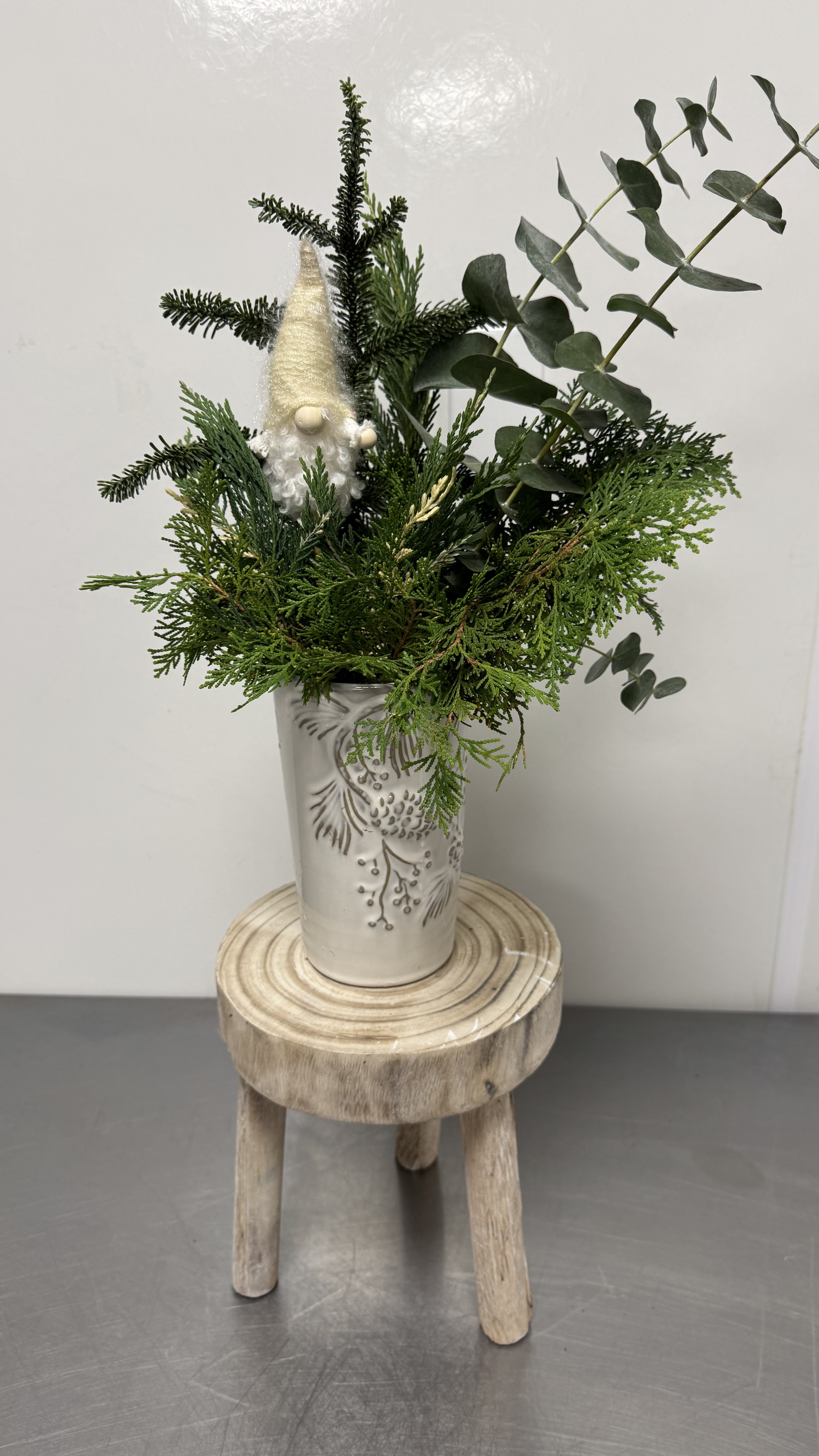 Petit arrangement dans un vase entre 12 et 14 pouces d'hauteur. Contient un mélange de feuillage hivernal avec un ornement