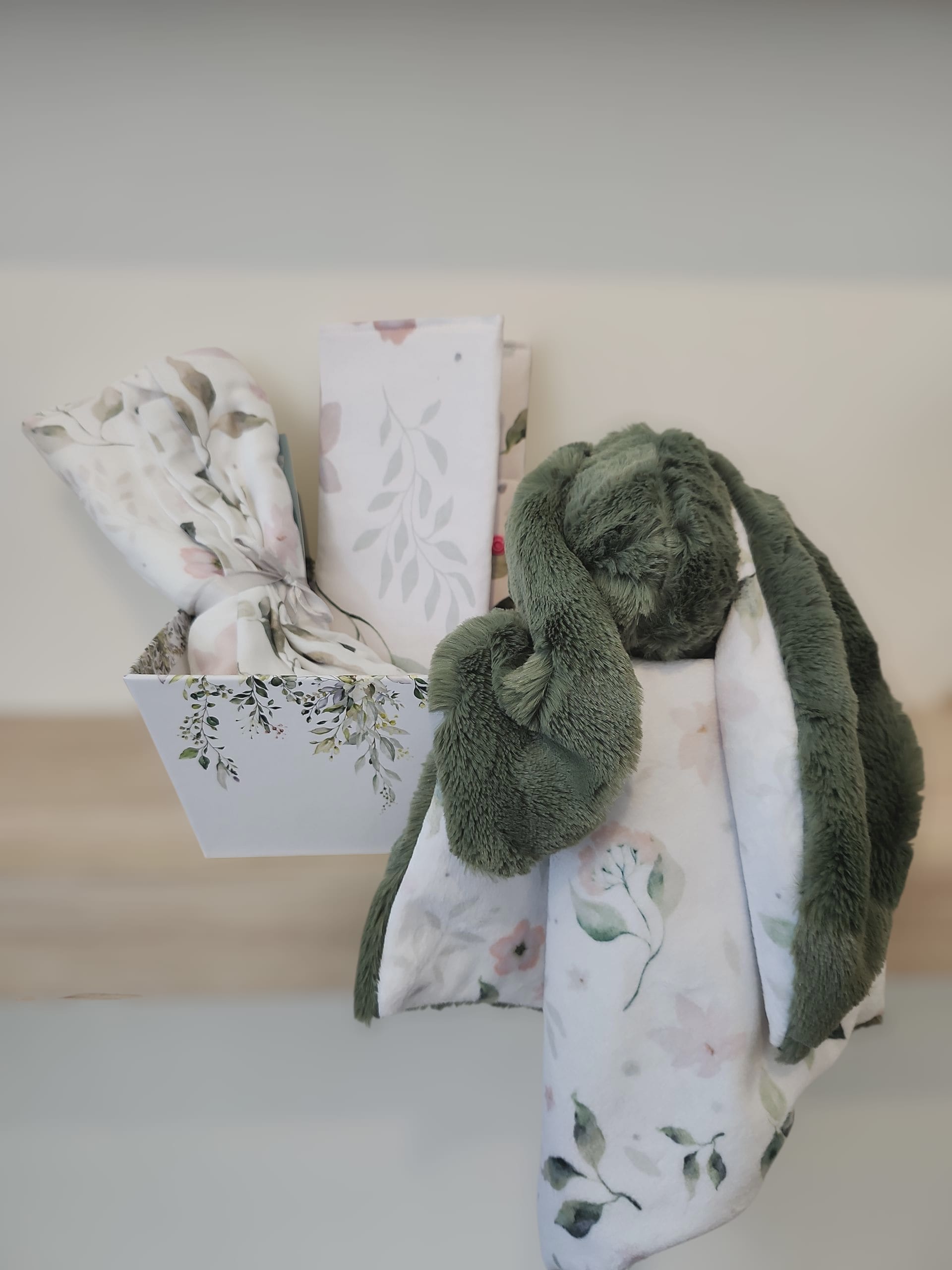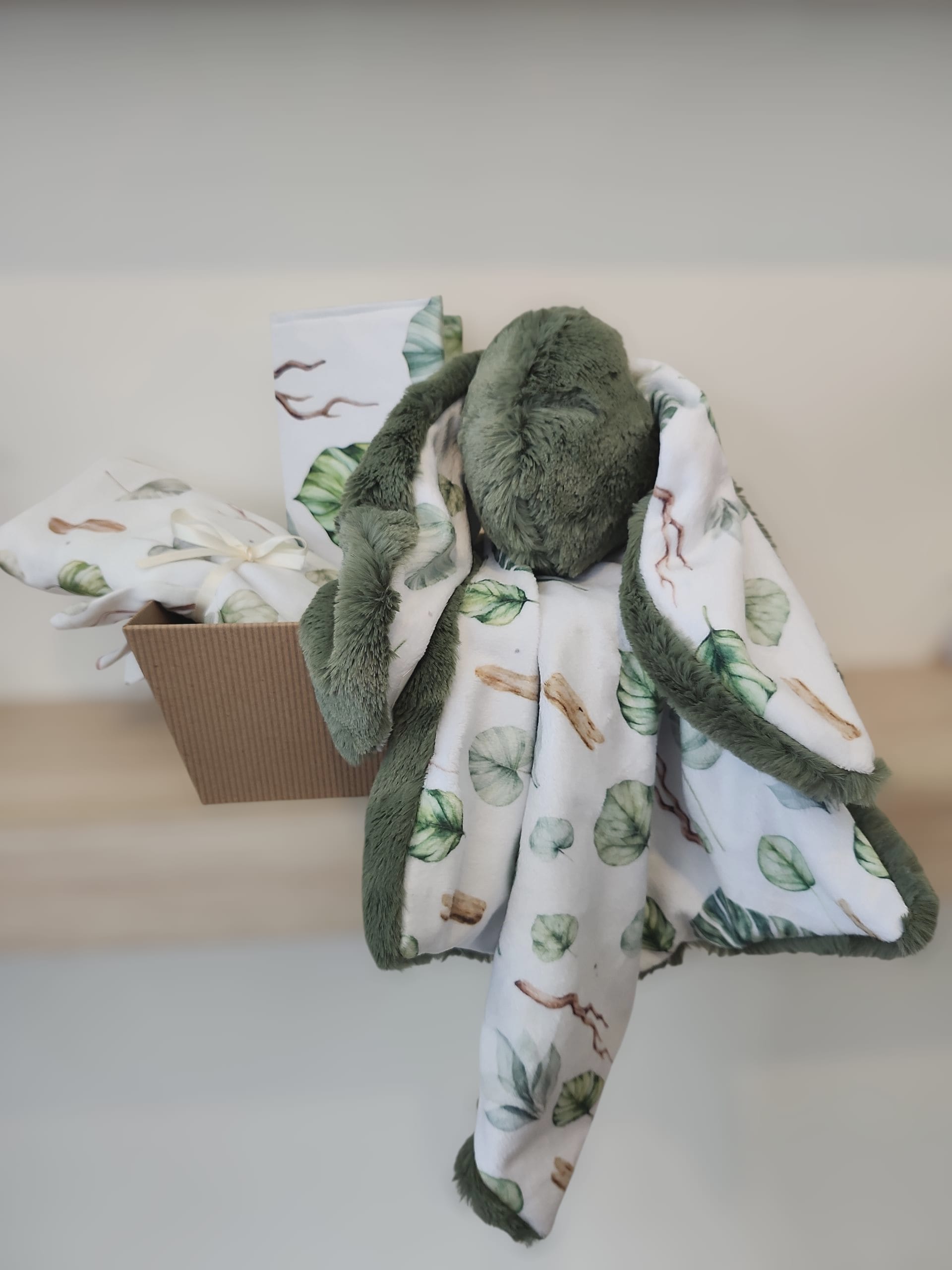 Panier cadeau comprenant portèrent carnet de santé, mousseline de bamboo et toutou doudou avec motif feuillage et de bois