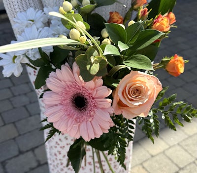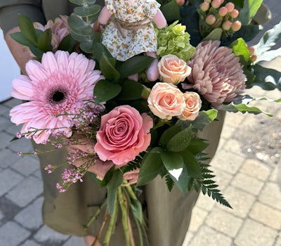 Bouquet de fleurs fraîches dans les tons de rose et blanc avec petit toutou. Photo en inspiration, fleurs au choix de la fleuriste