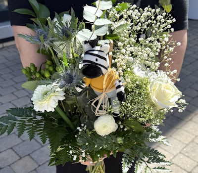 Bouquet de fleurs fraîches dans les tons de bleu et blanc avec petit toutou. Photo en inspiration, fleurs au choix de la fleuriste