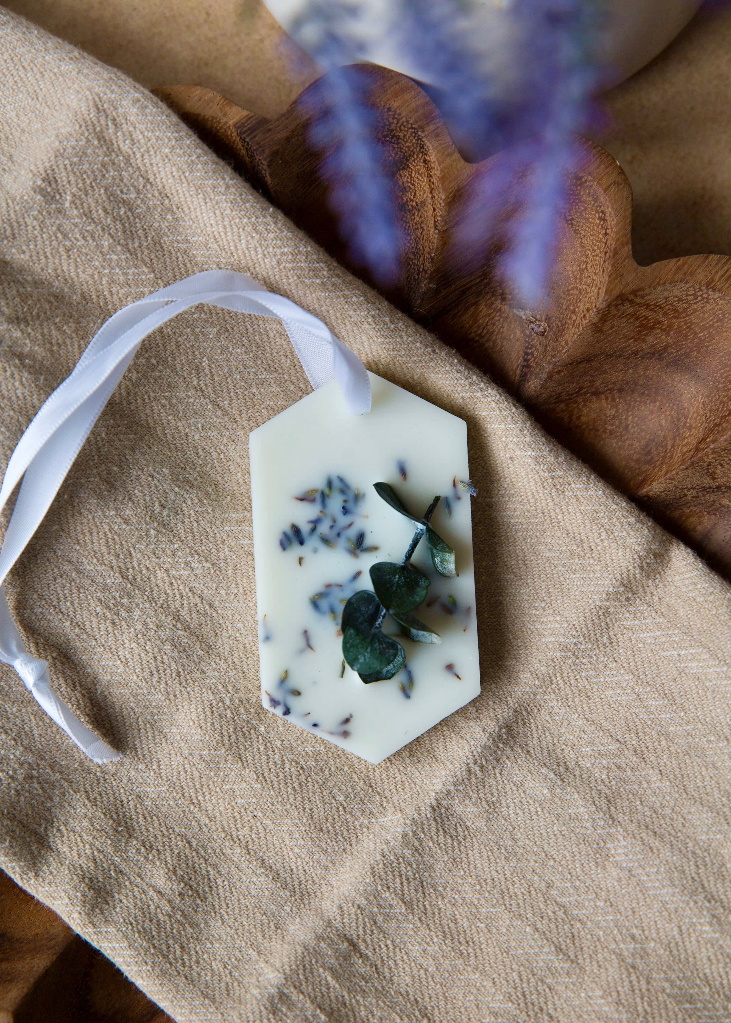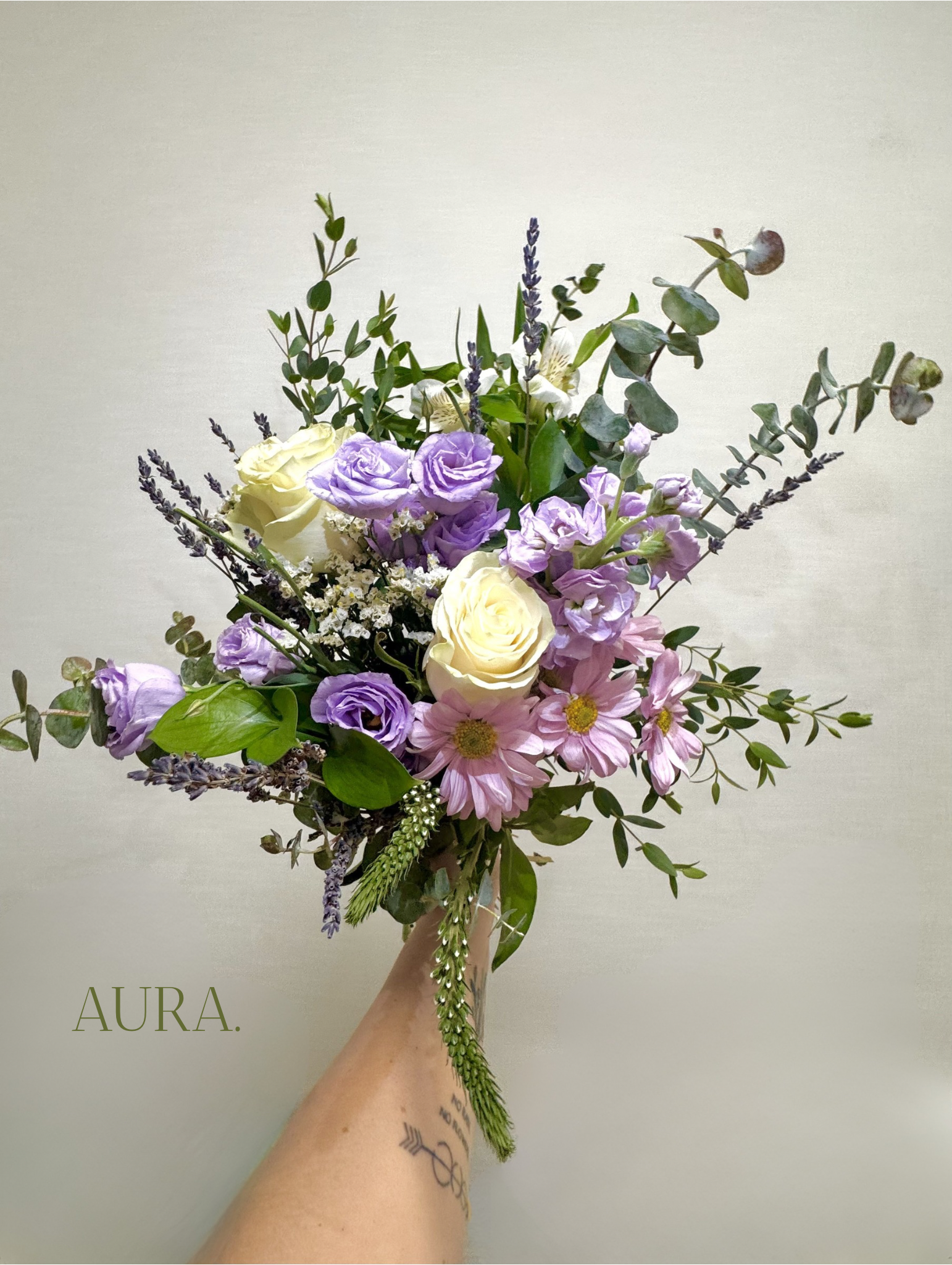 AURA. Un bouquet apaisant aux tons de lilas et crème incluant de la lavande séchée et accompagné d’une douce tablette parfumée à l’eucalyptus et lavande. Pensé pour offrir un moment de calme et de tendresse pour une des personne les plus importante de votre vie; maman.
