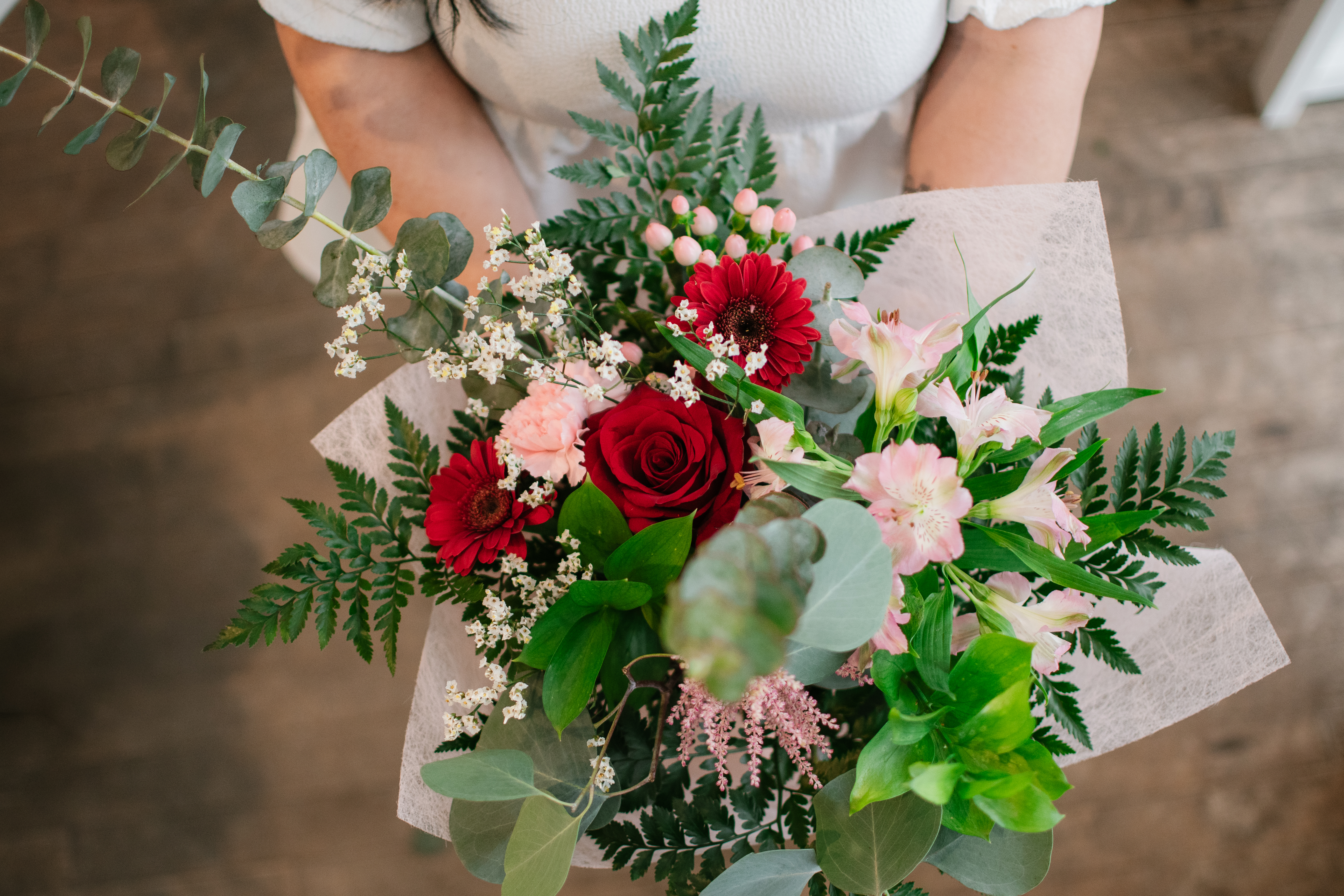 Bouquet d'inspiration romantique dans les teintes de rouge et rose