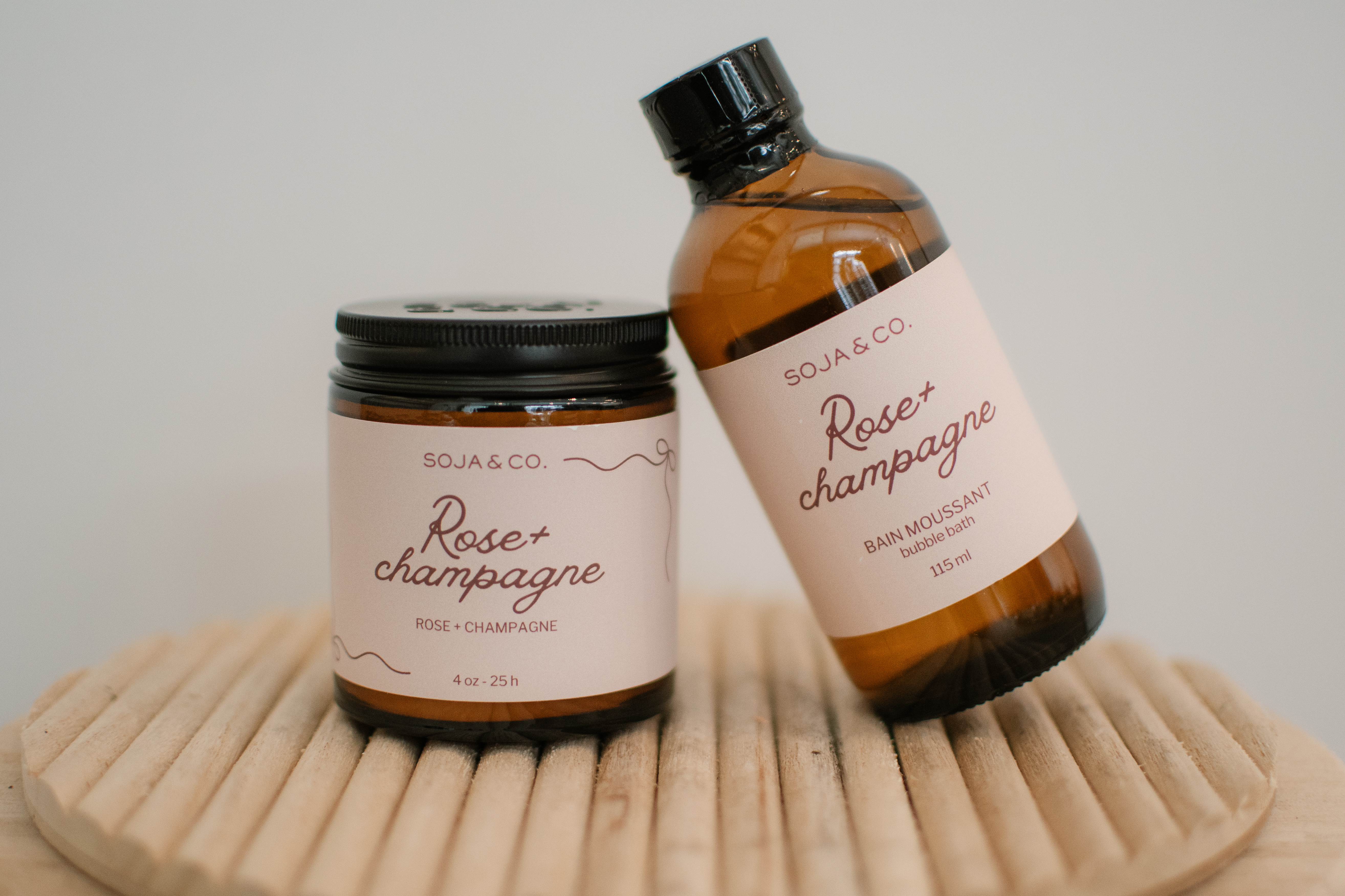 Ensemble de produit de marque soja et co. Chandelle 4 oz ainsi que de la mousse pour le bain rose et champagne