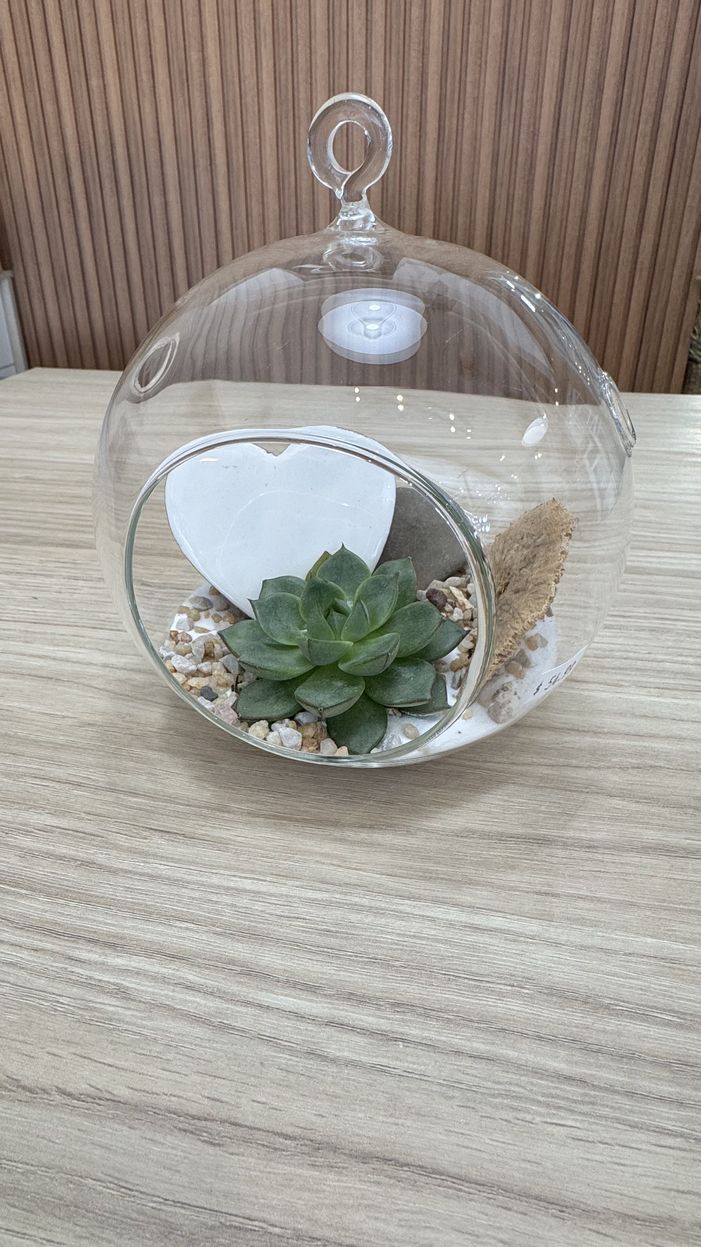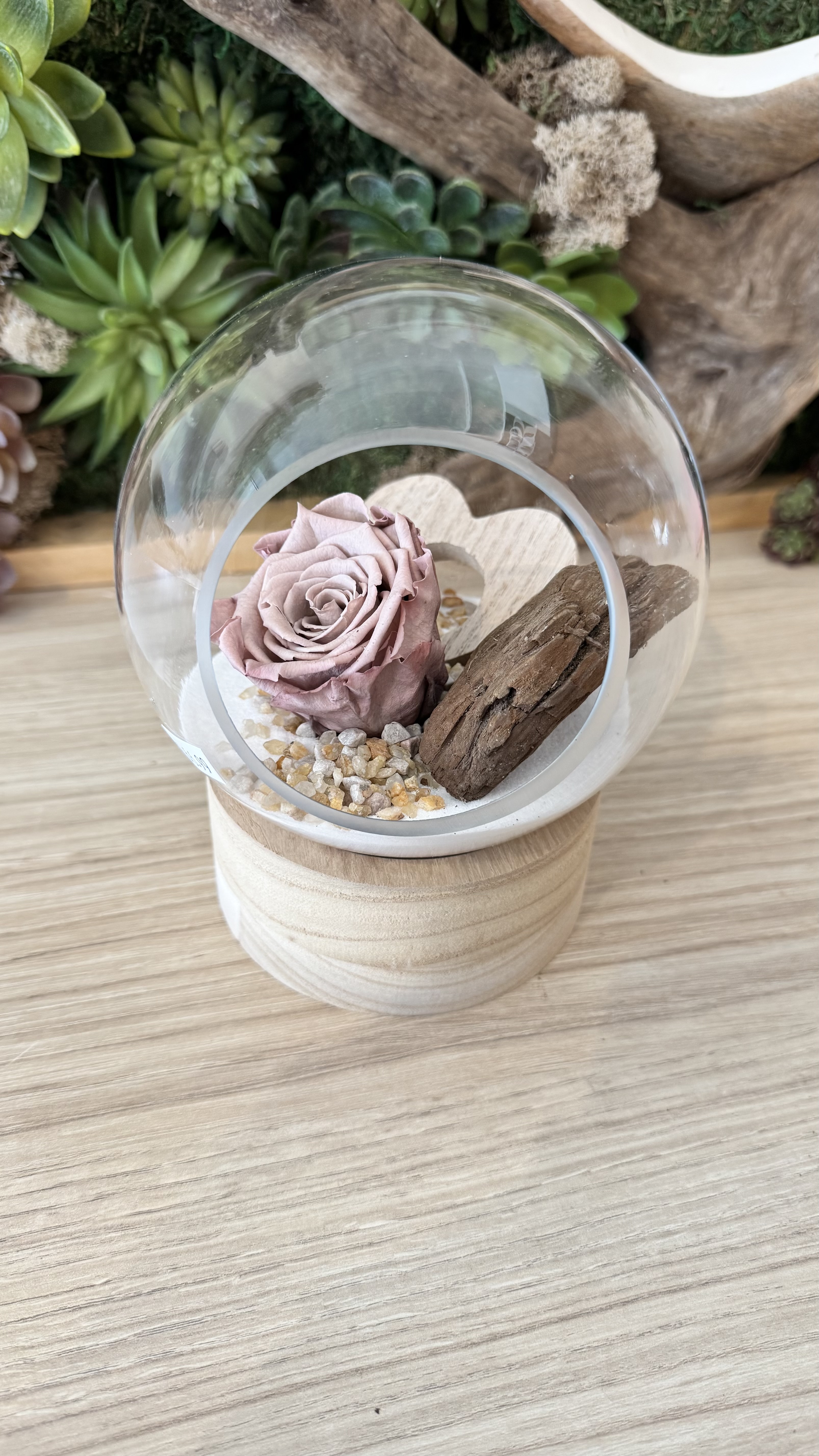 Terrarium sur base de bois 6 pouces de large avec rose éternelle vieux rose.