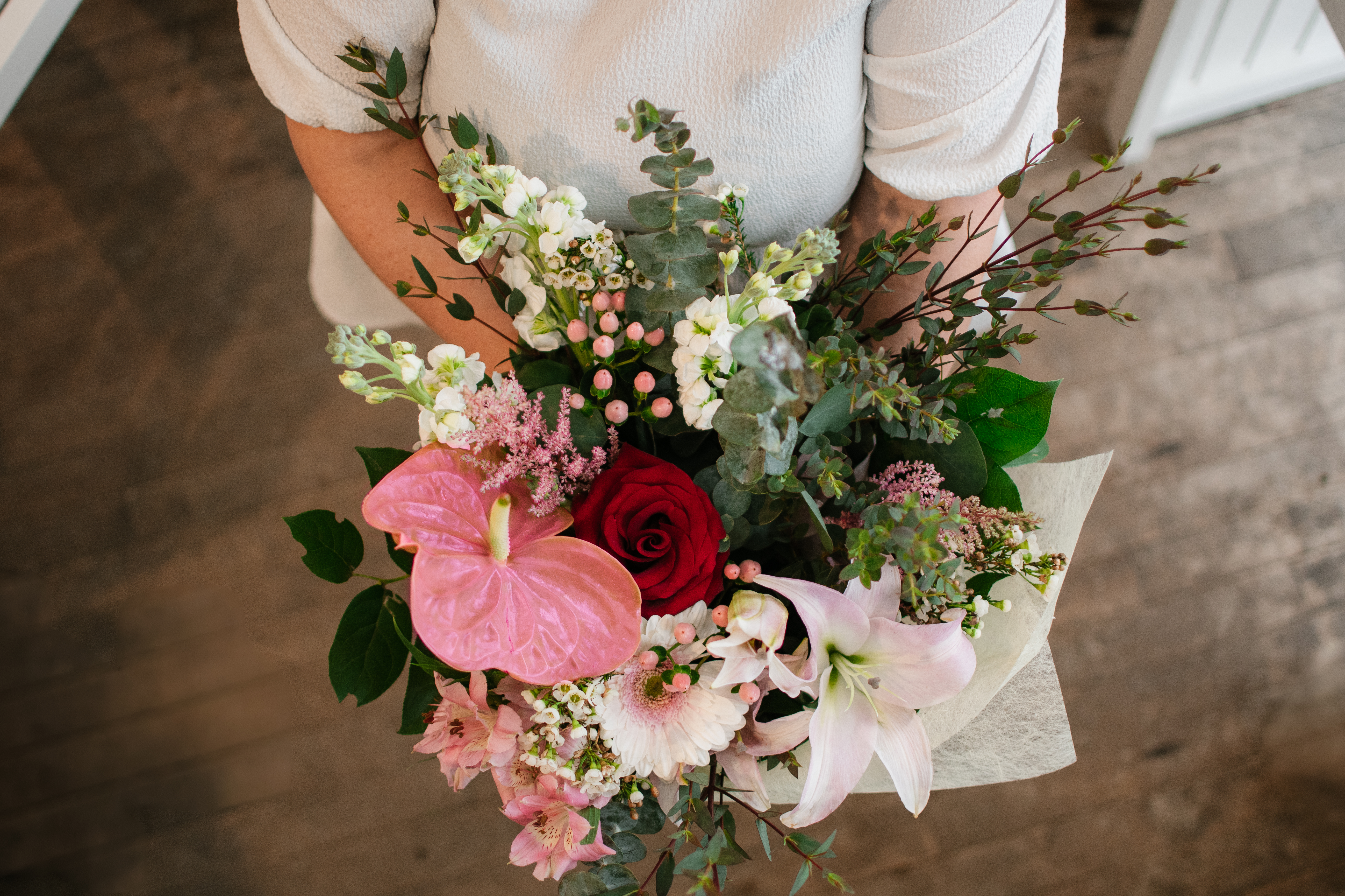 Bouquet romantique avec des fleurs uniques tel que l'anthurium rose et lys rose