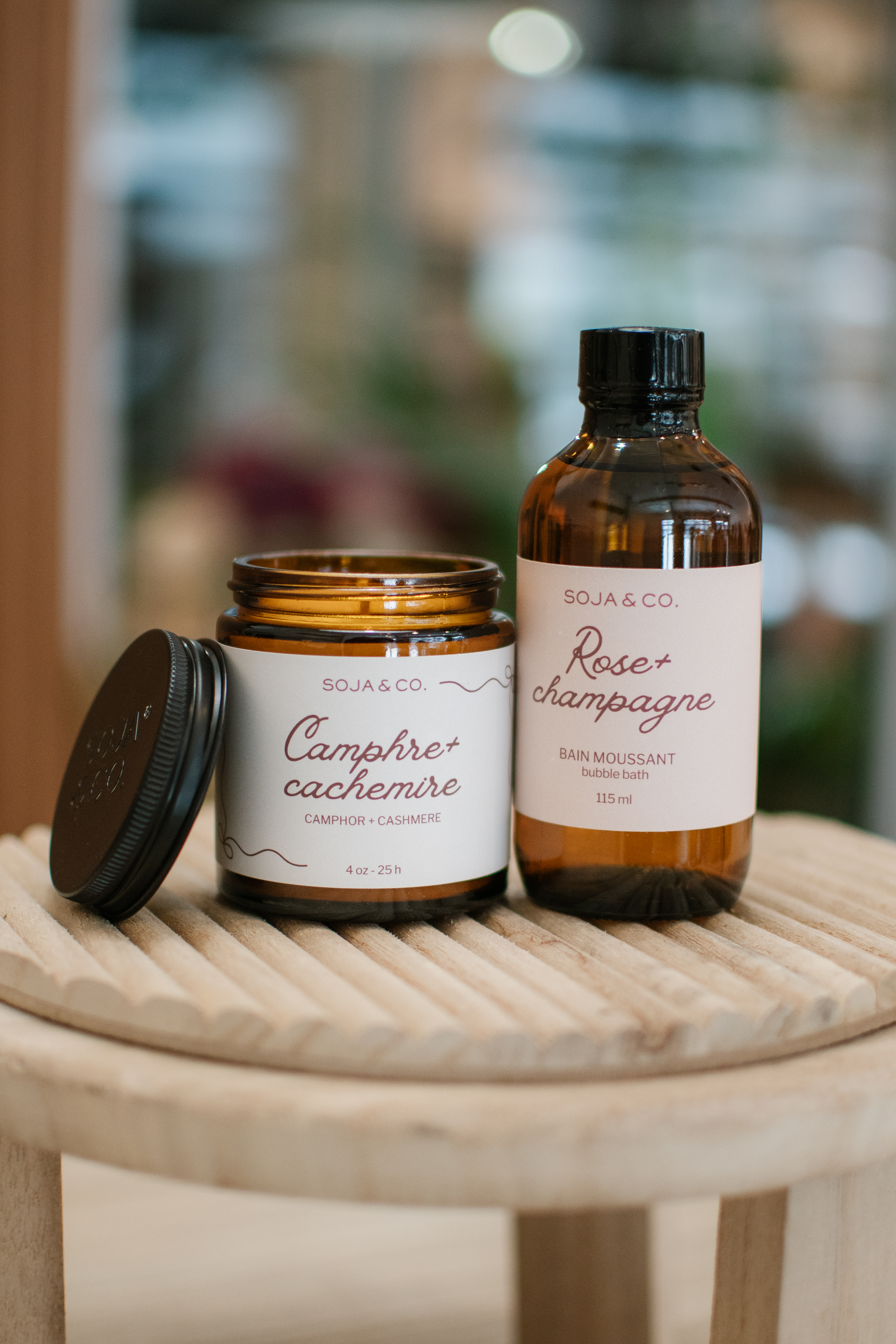 Ensemble de produit de marque soja et co. Chandelle 4 oz camphre et cachemire ainsi que de la mousse pour le bain rose et champagne